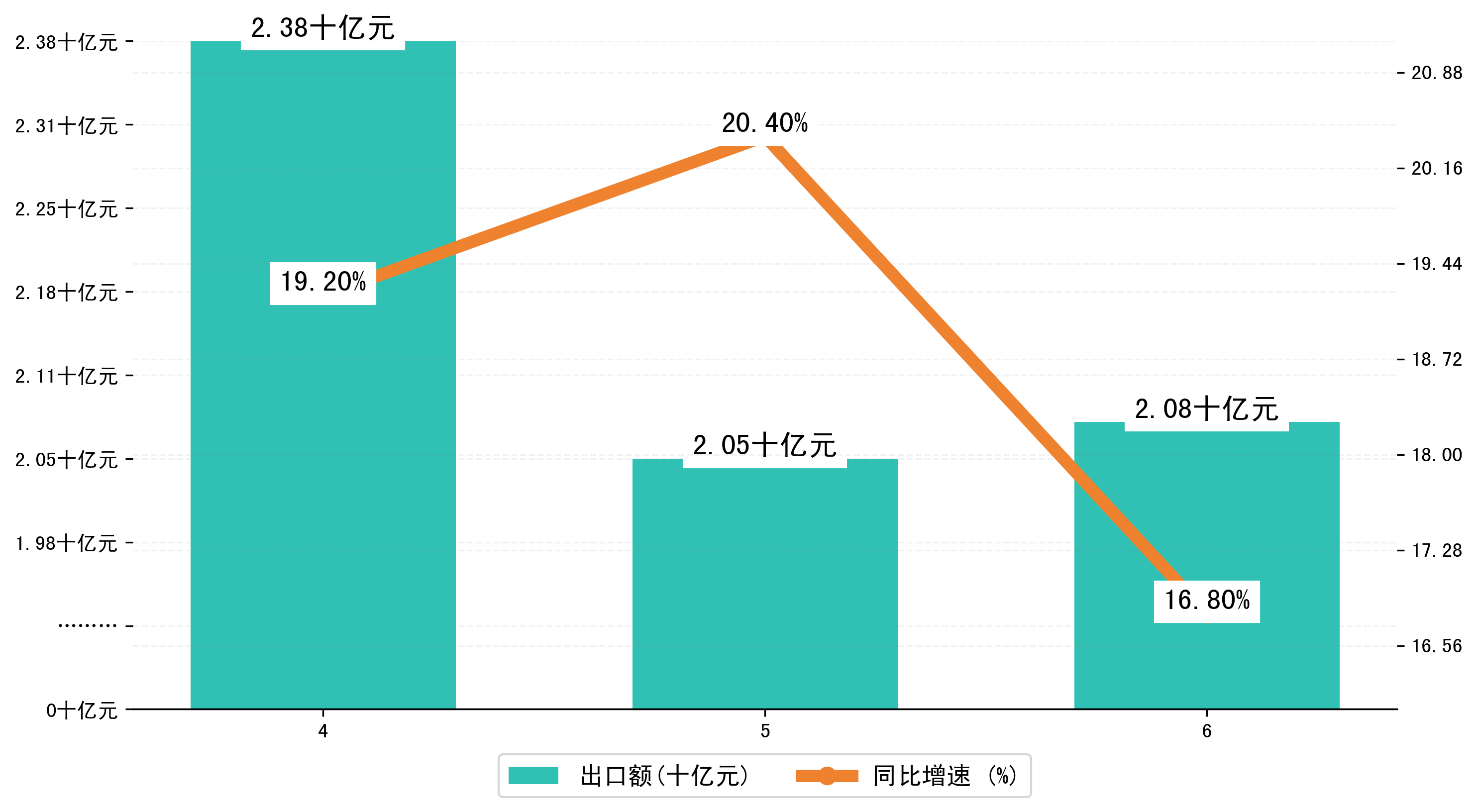 以人民币计,2024年6月马鞍山市出口额为20,7798.3099万元,相比上月增加了2876.2322万元;相比上年同期减少了4220.2818万元,同比增加了16.80%。