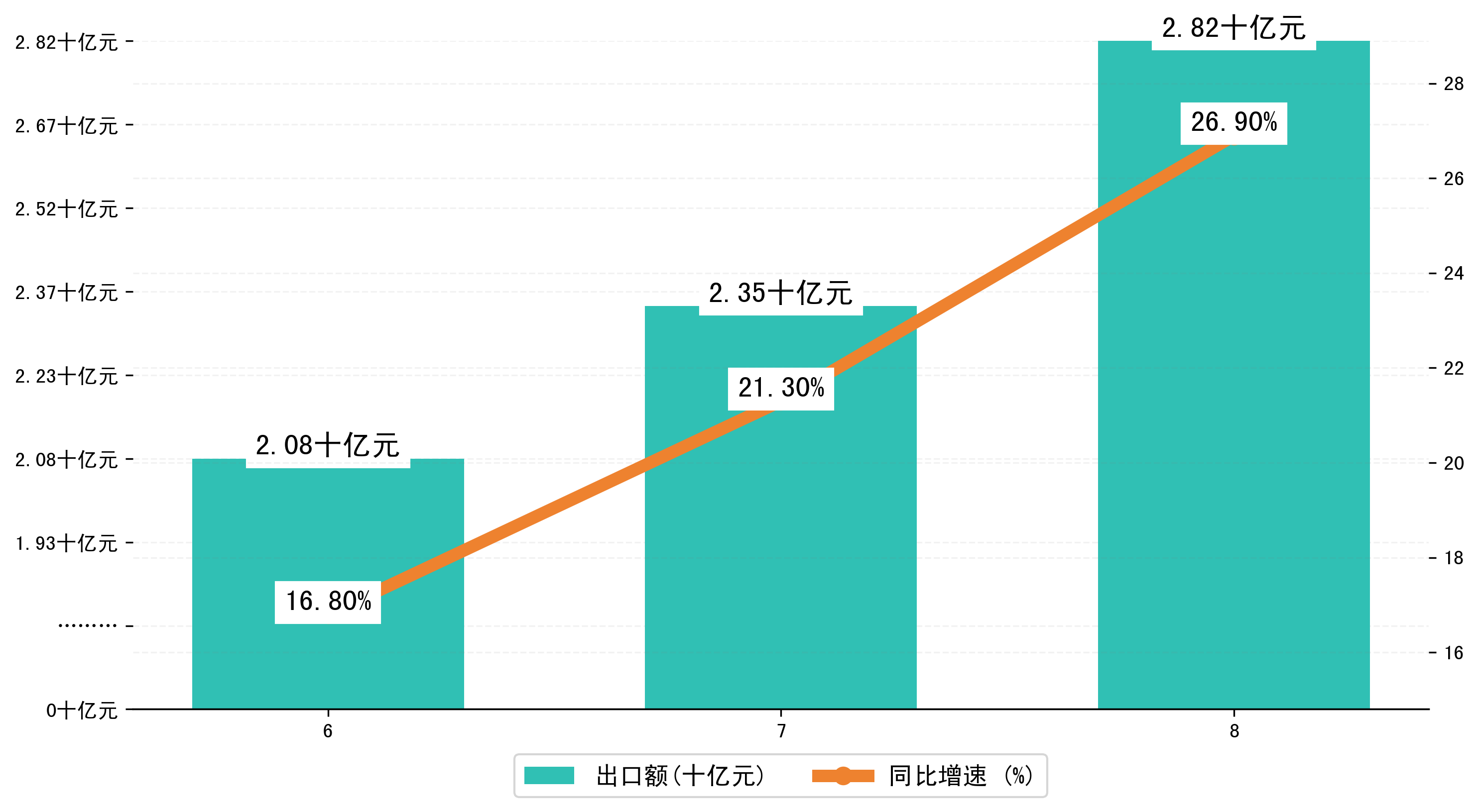 以人民币计,2024年1-8月马鞍山市出口额为172,3603.8585万元,相比上年同期增加了30,5831.0413万元,同比增加了26.90%。