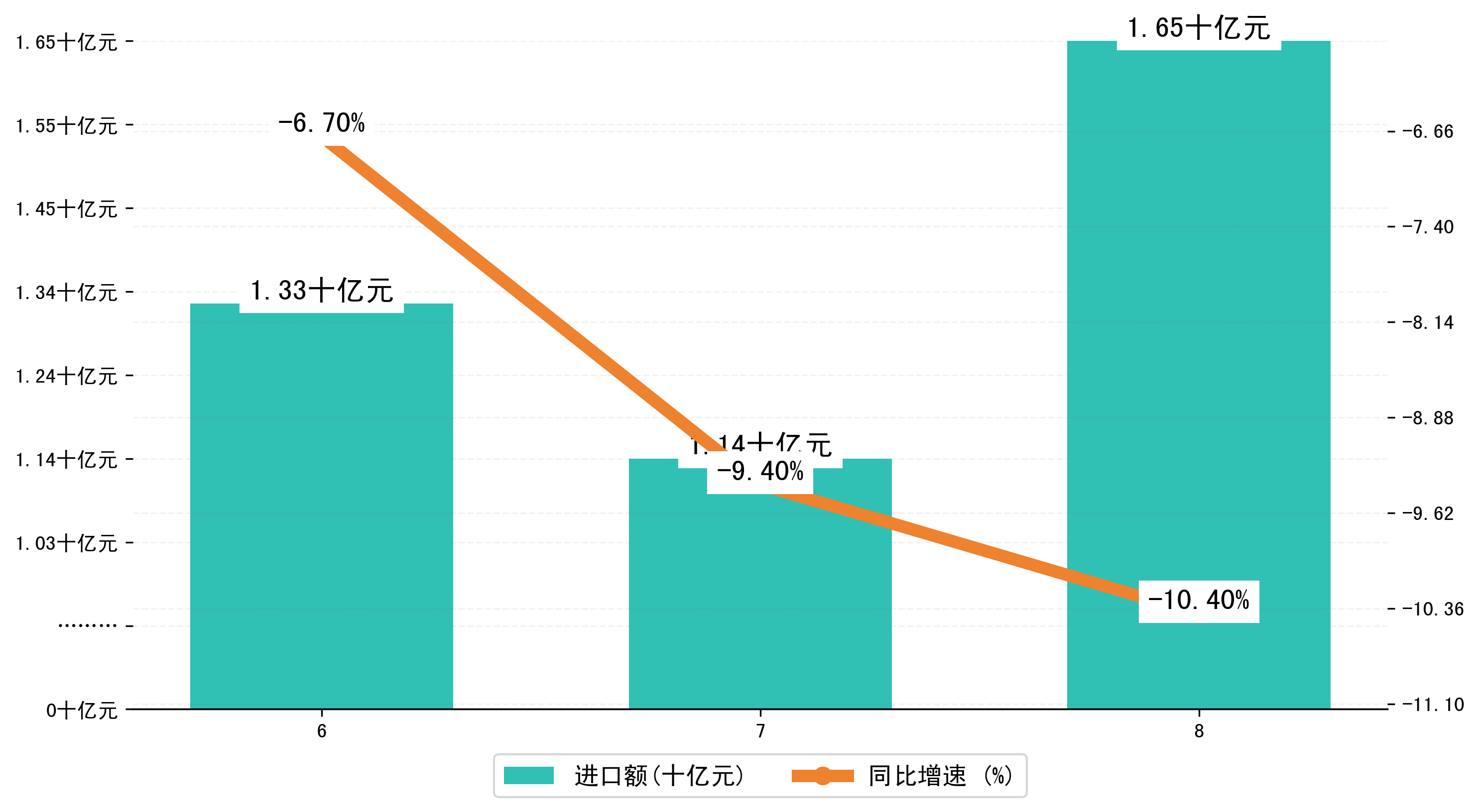 以人民币计,2024年1-8月马鞍山市进口额为119,6584.3448万元,相比上年同期减少了17,7183.9857万元,同比减少了-10.40%。