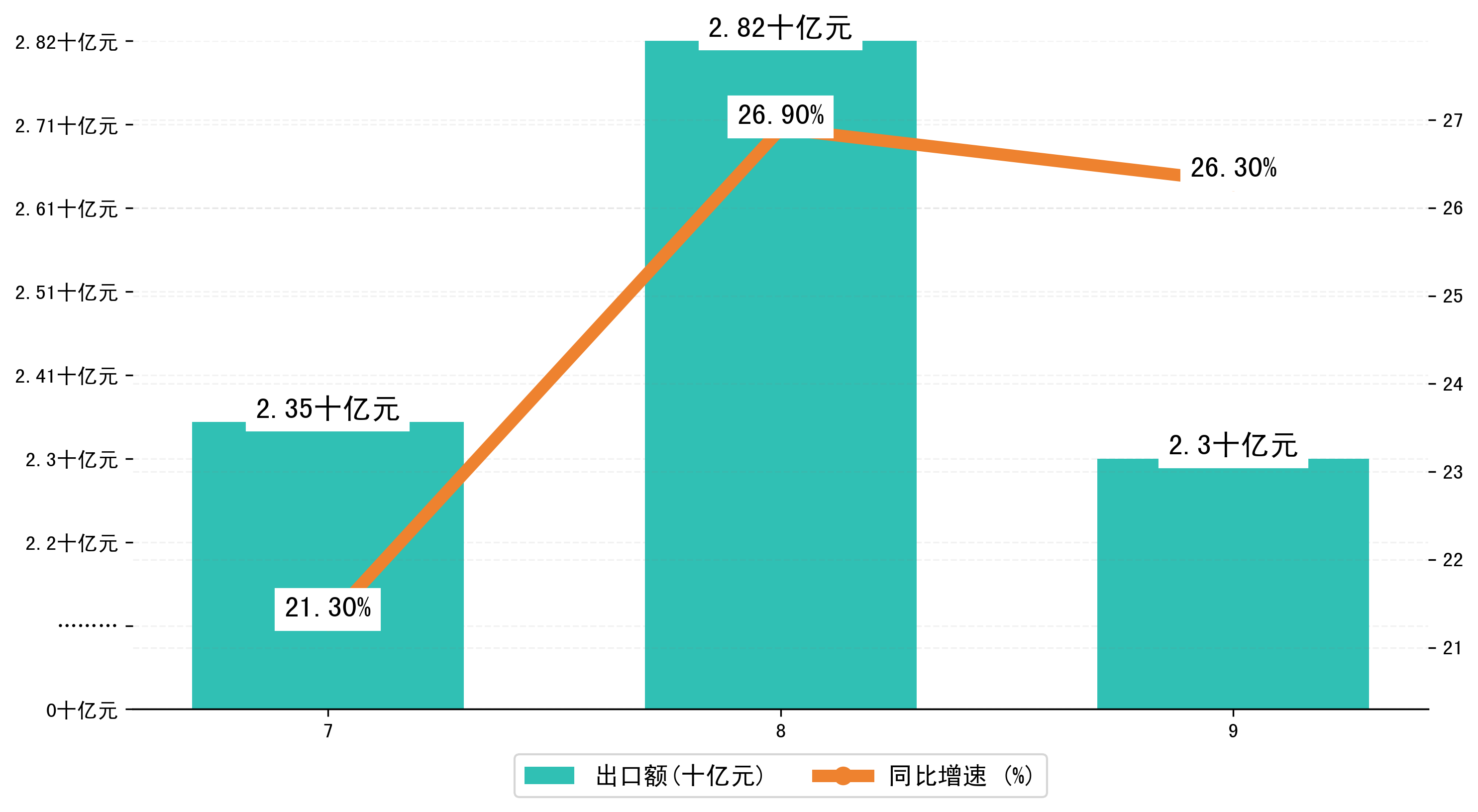 以美元计,2024年9月马鞍山市出口额为3,2282.3435万美元,相比上月减少了7222.8887万美元;相比上年同期增加了6004.268万美元,同比增加23.90%。