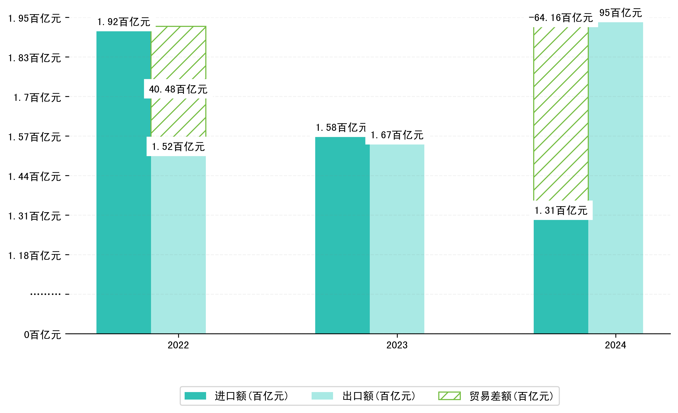 以人民币计,2024年1-9月马鞍山市贸易差额为64,1556,3786万元(贸易顺差),相比上年同期增加了65,8226,6513万元,同比增加-3948.51%。