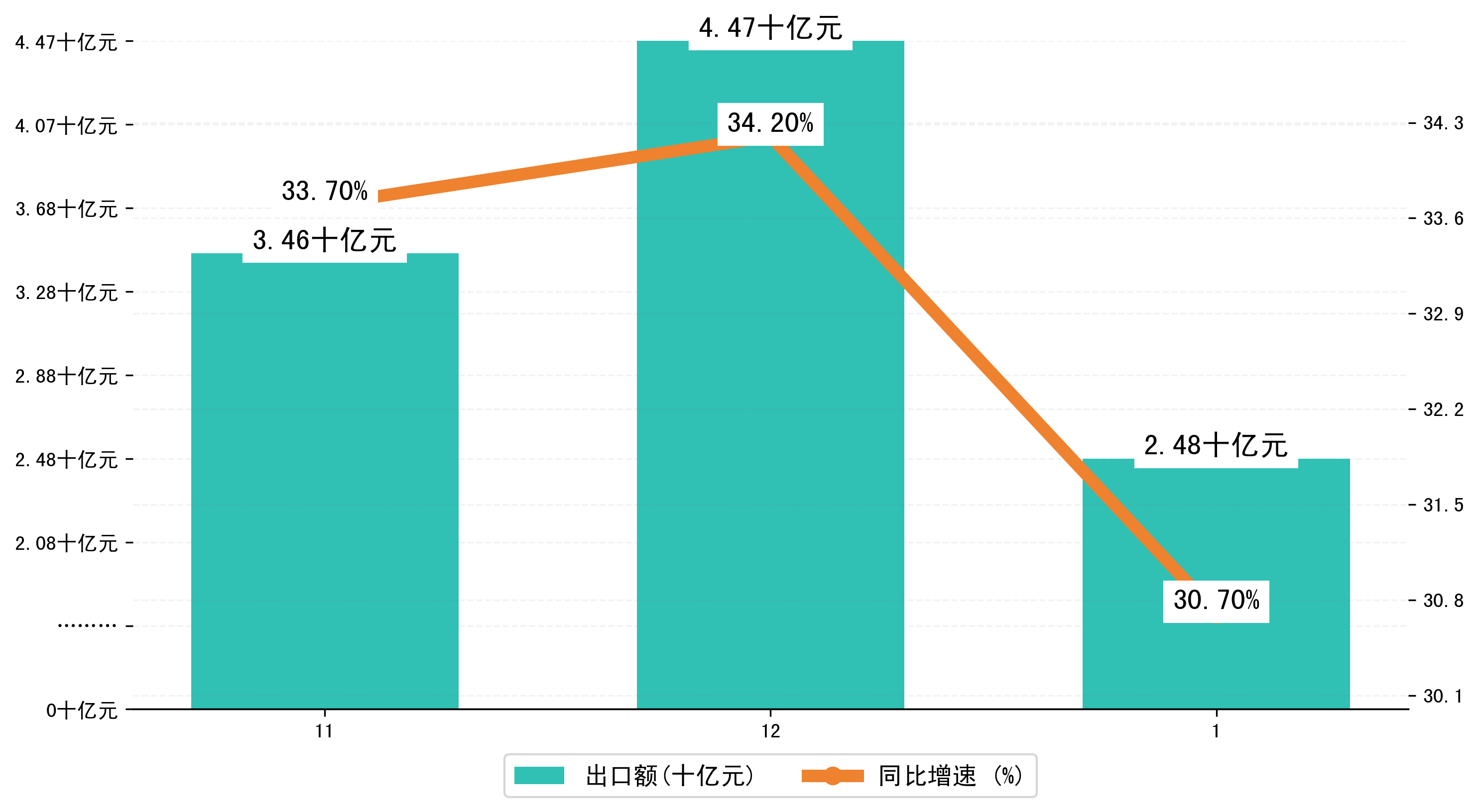 以美元计,2025年1-1月马鞍山市出口额为3,4498.4013万美元,相比上年同期增加了7790.3574万美元,同比增加29.20%。