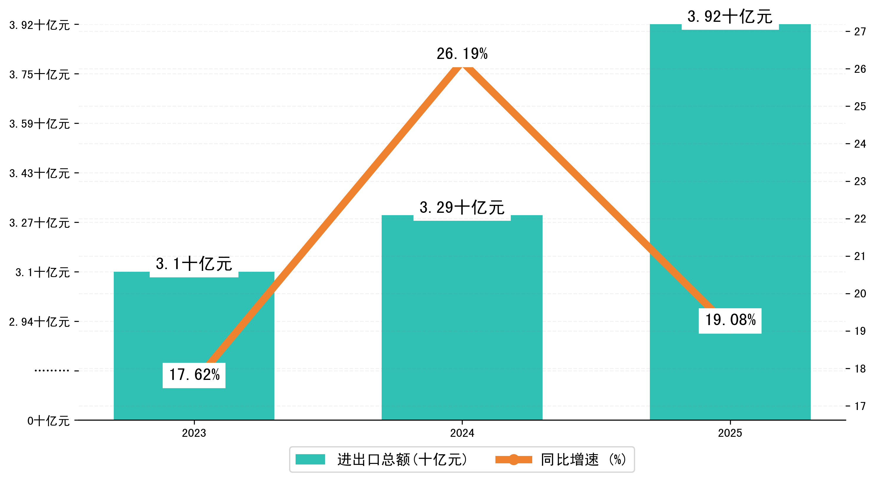 以美元计,2025年1-1月马鞍山市进出口总额为5,4459.0662万美元,相比上年同期增加了8240.1869万美元,同比增加17.10%。