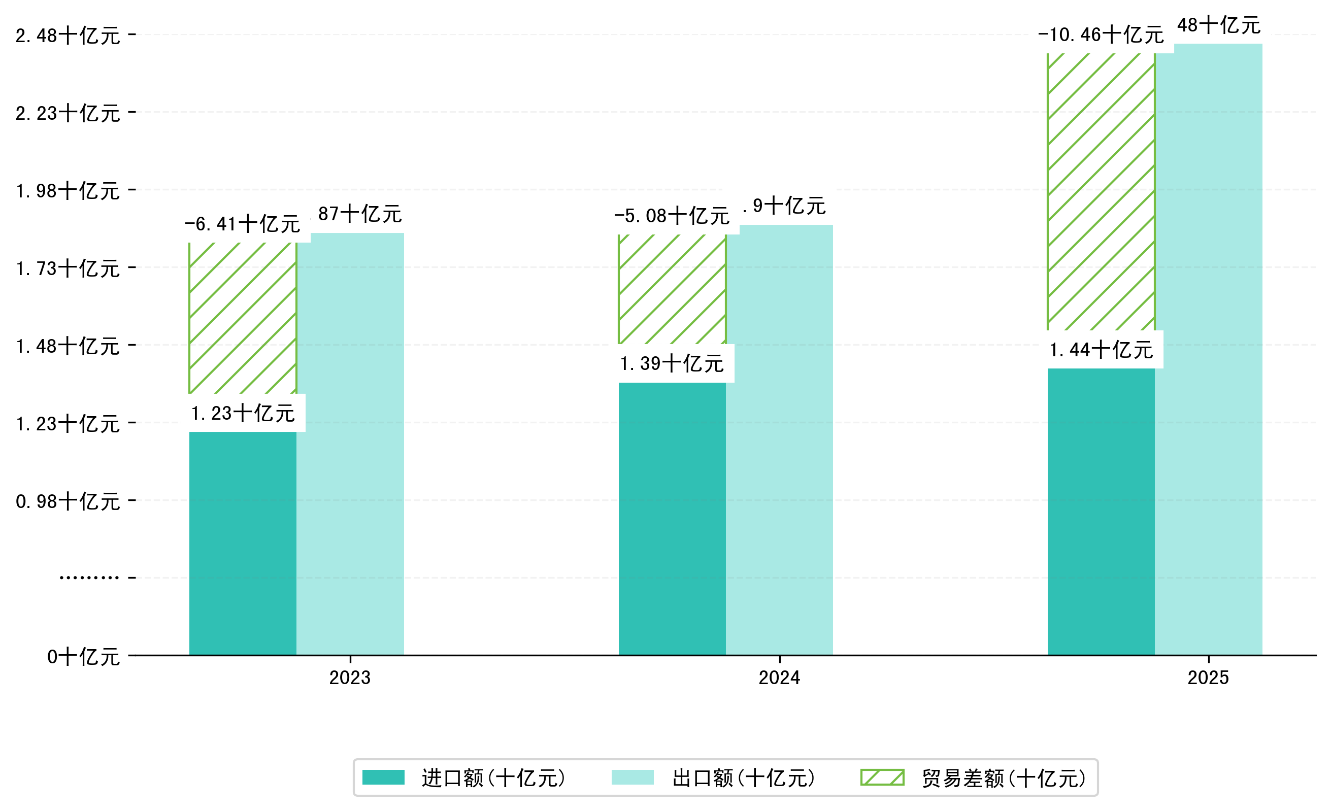 以人民币计,2025年1月马鞍山市贸易差额为10,4591,0318万元(贸易顺差),相比上月减少了20,3341,9334万元,即2,8303,3293万美元;相比上年同期增加了5,3767,6129万元,同比增加105.79%。