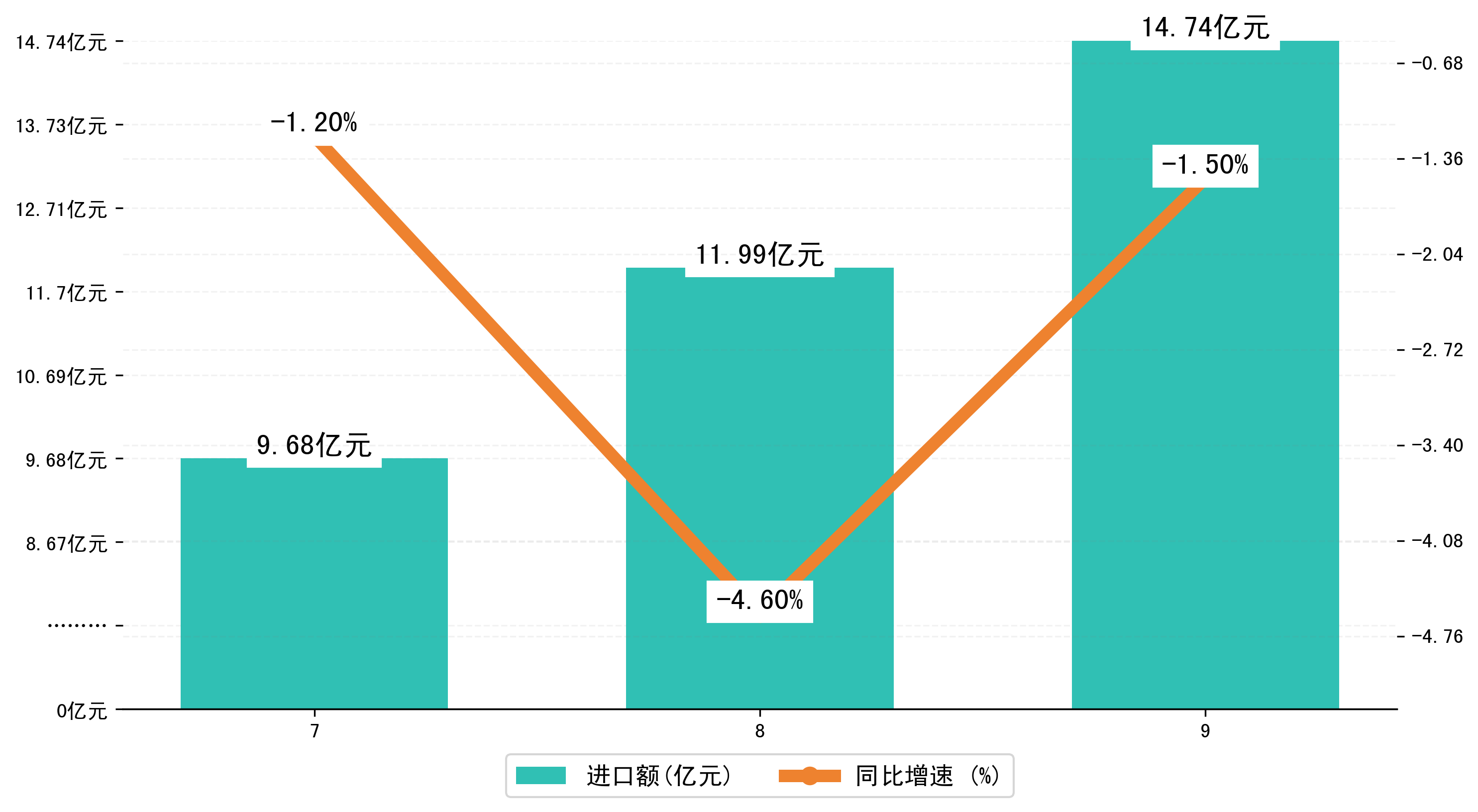 以人民币计,2025年9月马鞍山市进口额为14,7384.022万元,相比上月增加了2,7496.7716万元;相比上年同期增加了3,0526.0417万元,同比减少了-1.50%。