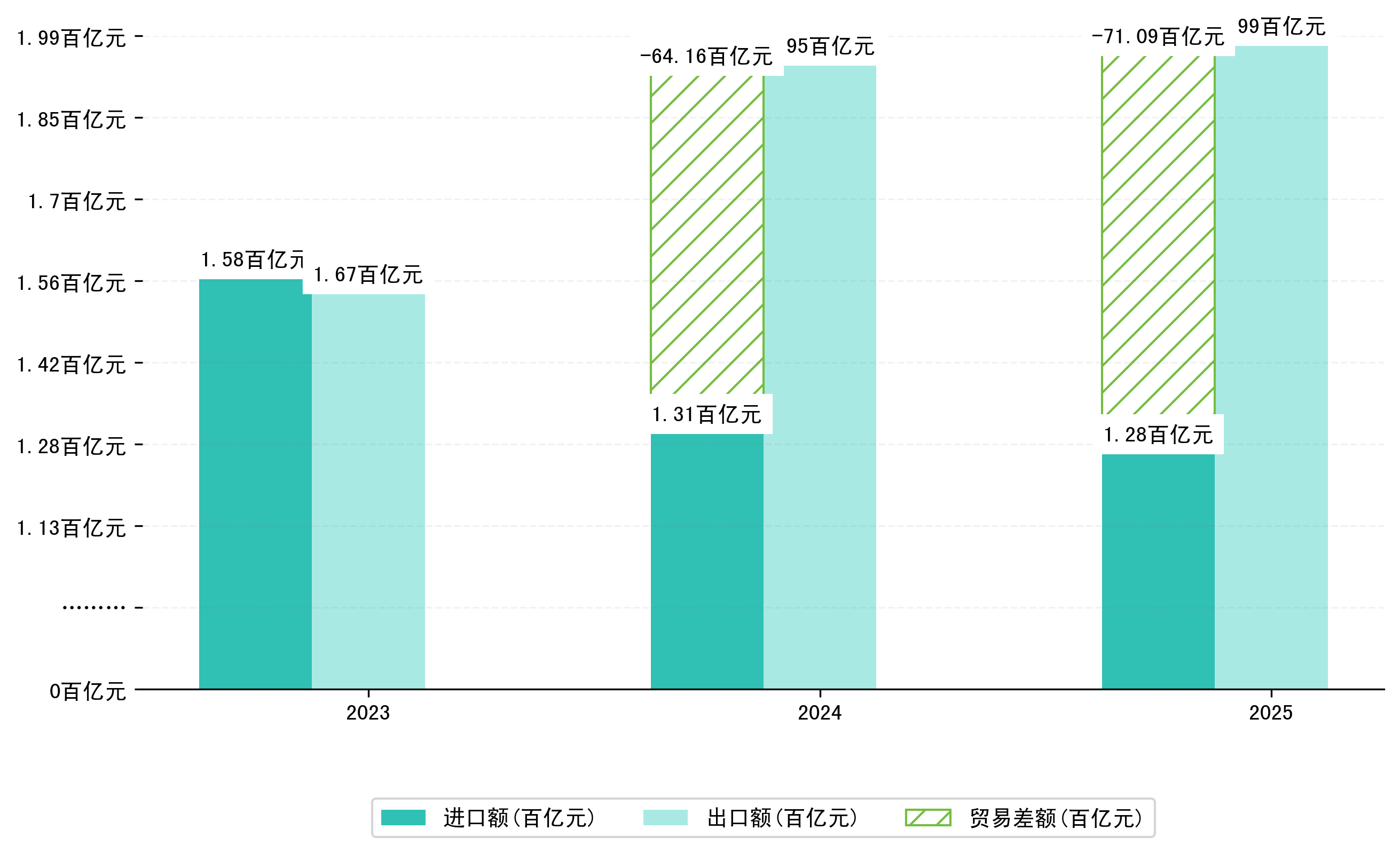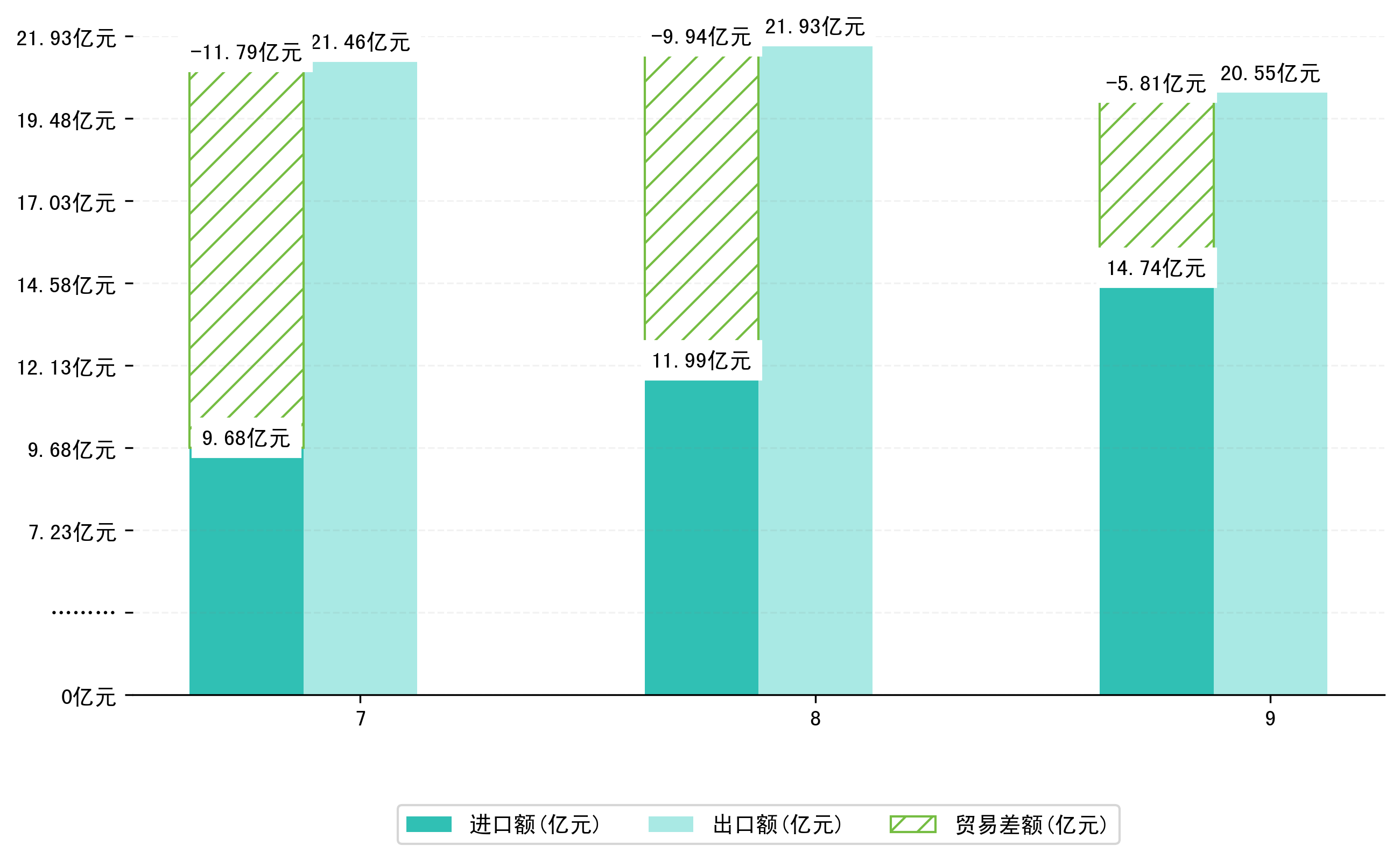 以人民币计,2025年1-9月马鞍山市贸易差额为71,0938,9495万元(贸易顺差),相比上年同期增加了6,9382,5709万元,同比增加10.81%。