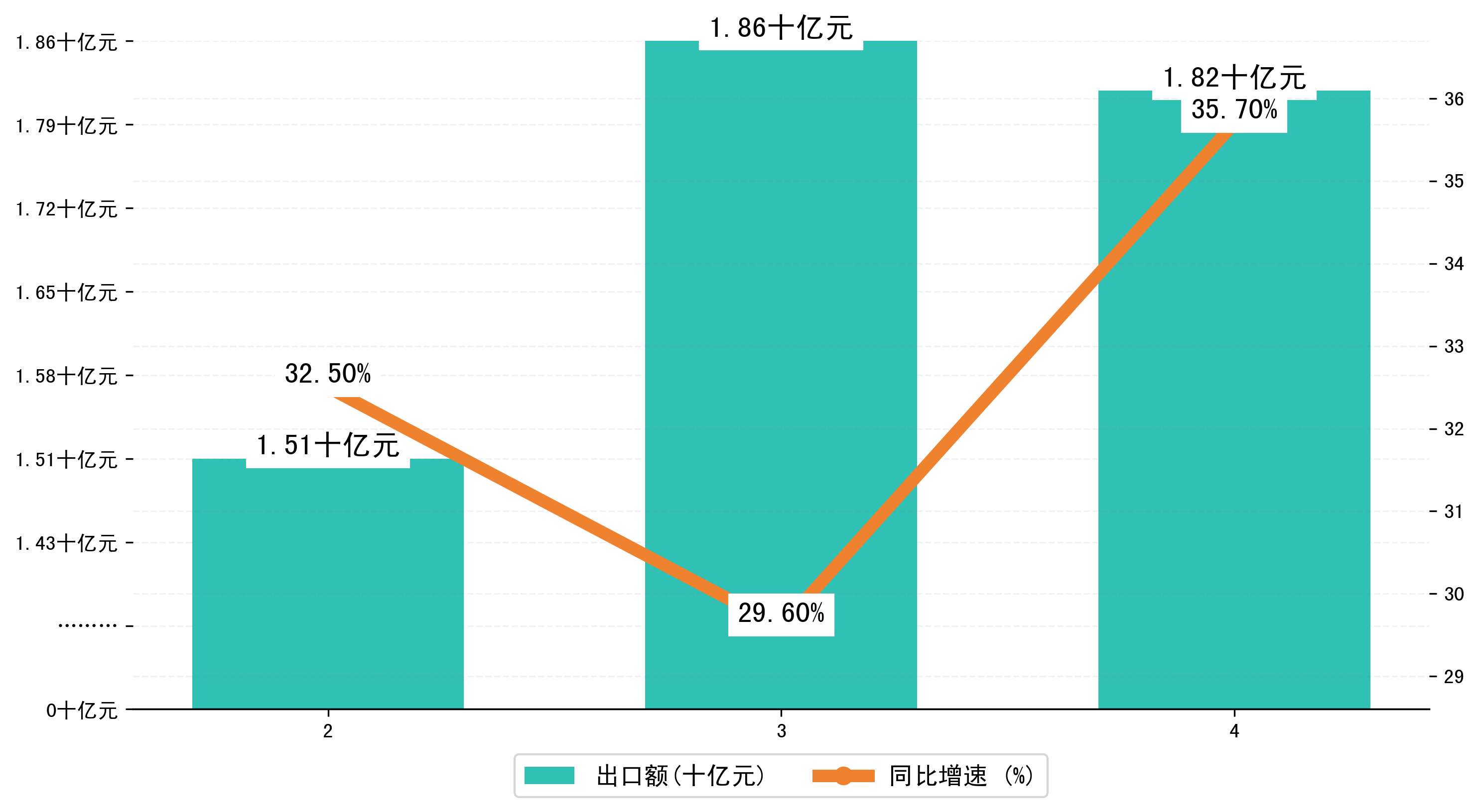 以人民币计,2023年1-4月马鞍山市出口额为70,6499.1825万元,相比上年同期增加了18,5879.957万元,同比增加了35.70%。