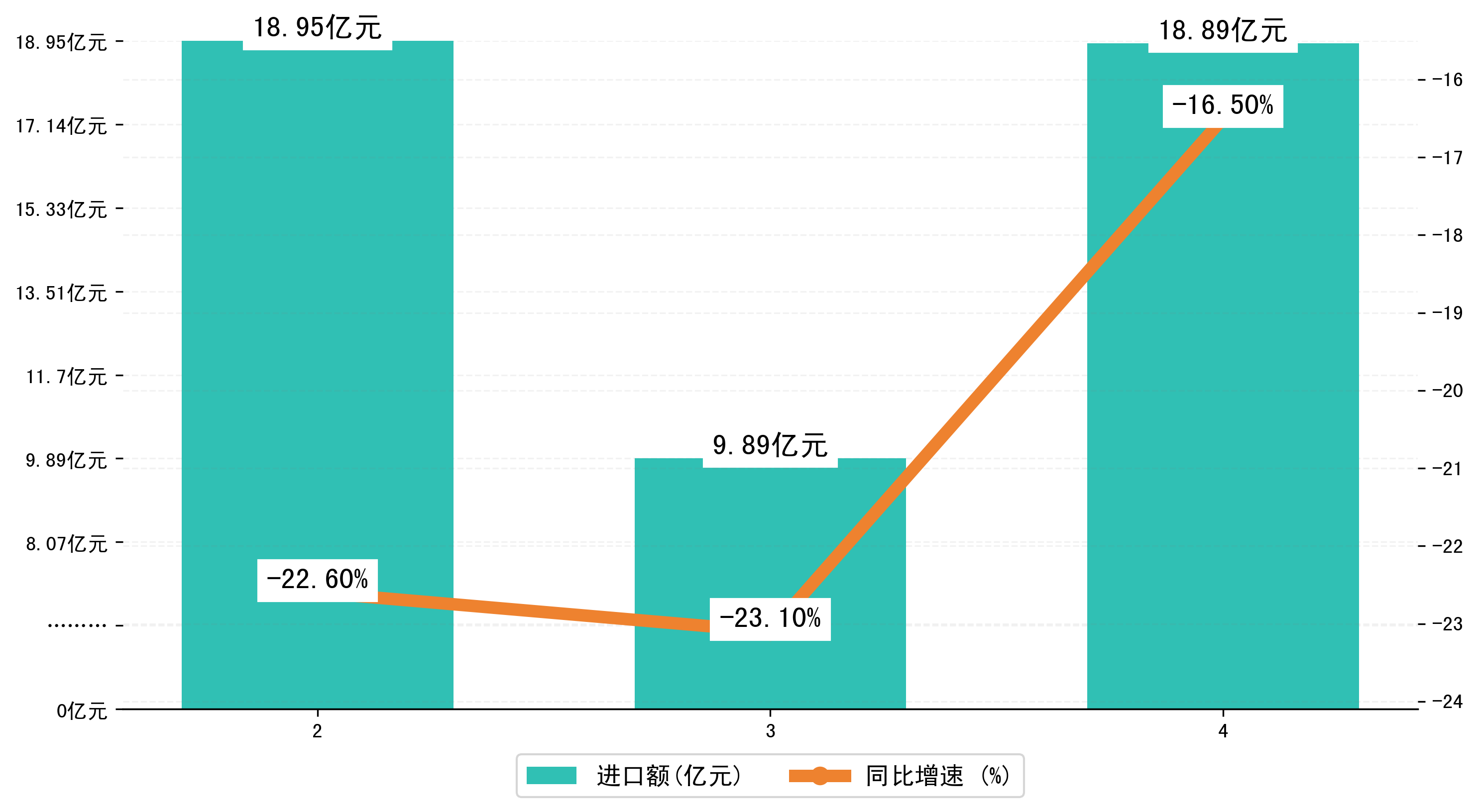 以人民币计,2023年1-4月马鞍山市进口额为60,4505.0162万元,相比上年同期减少了8,6080.4274万元,同比减少了-16.50%。