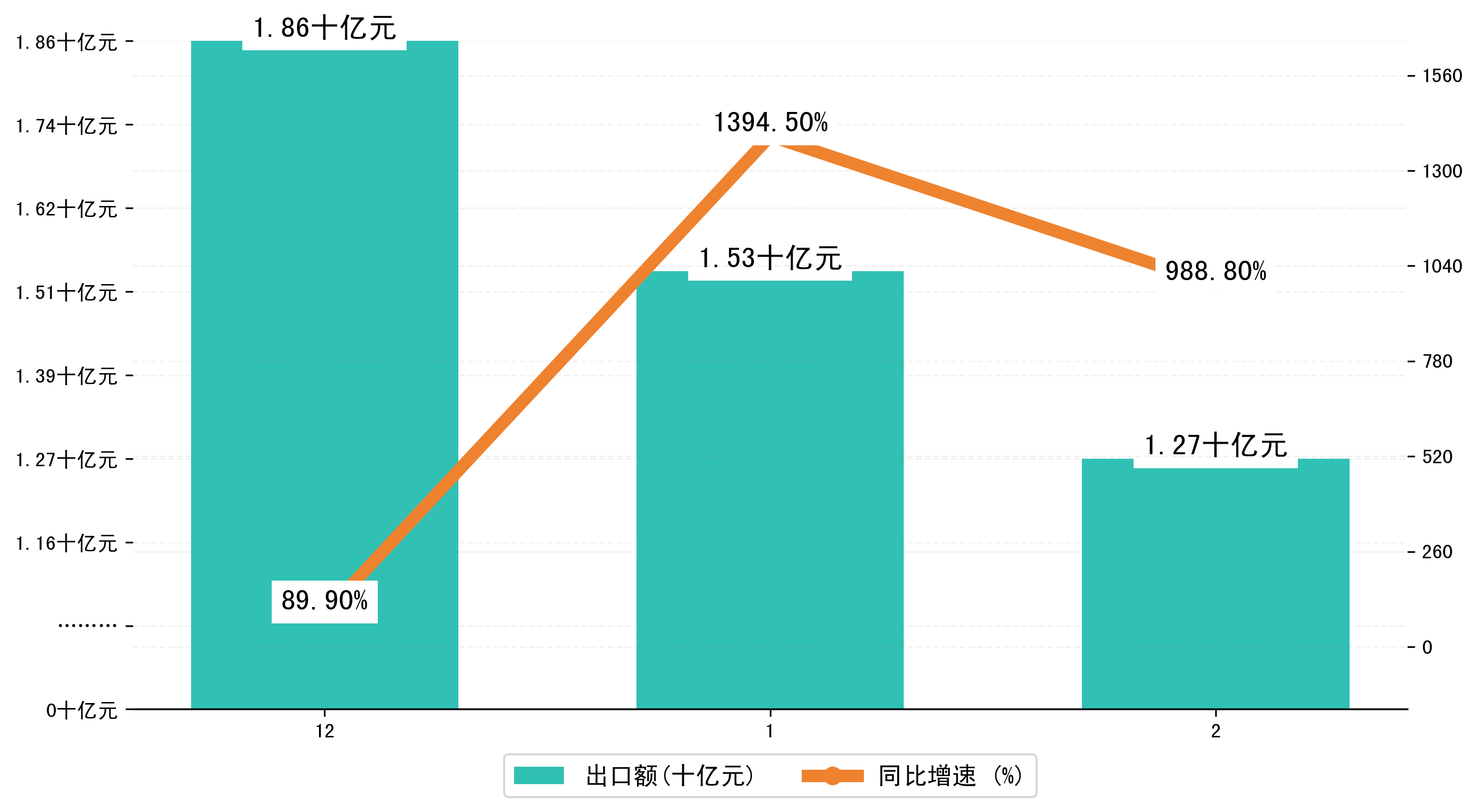 以人民币计,2023年1-2月满洲里市出口额为28,0651.1832万元,相比上年同期增加了25,4319.6254万元,同比增加了988.80%。