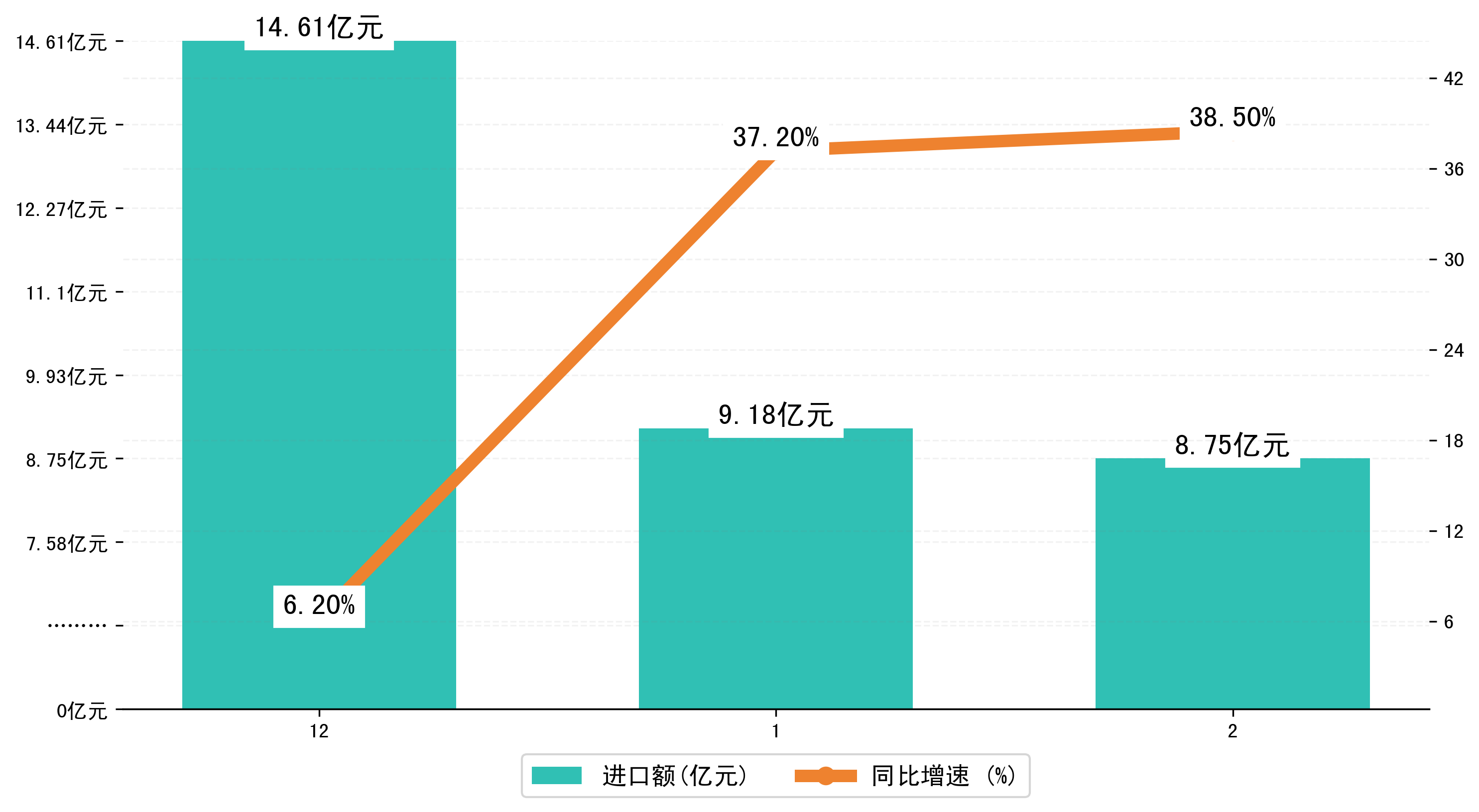 以美元计,2023年1-2月满洲里市进口额为2,5935.348万美元,相比上年同期增加了5852.9408万美元,同比增加27.80%。