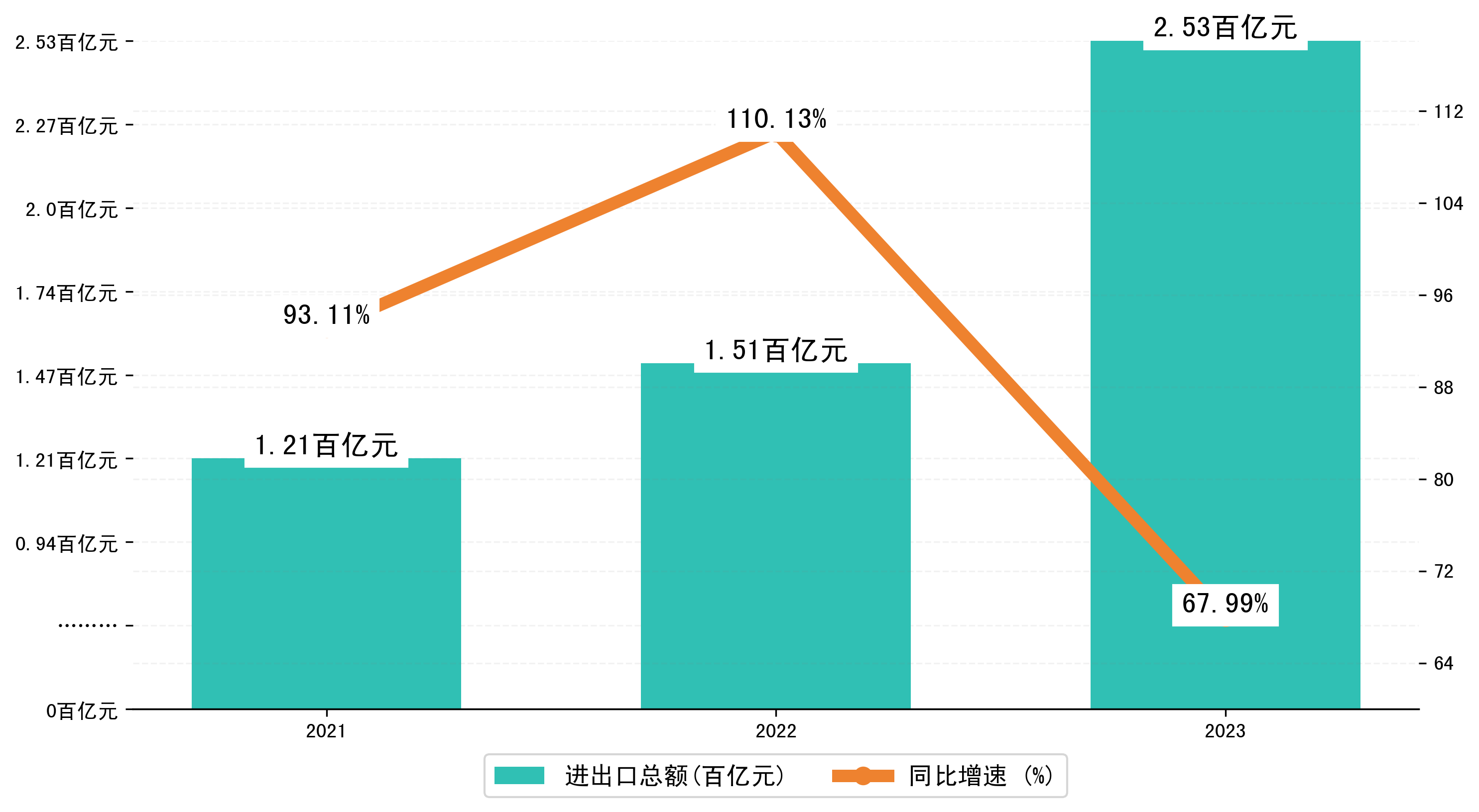 以人民币计,2023年1-12月满洲里市进出口总额为253,4932.4451万元,相比上年同期增加了102,5989.3701万元,同比增加了67.60%。