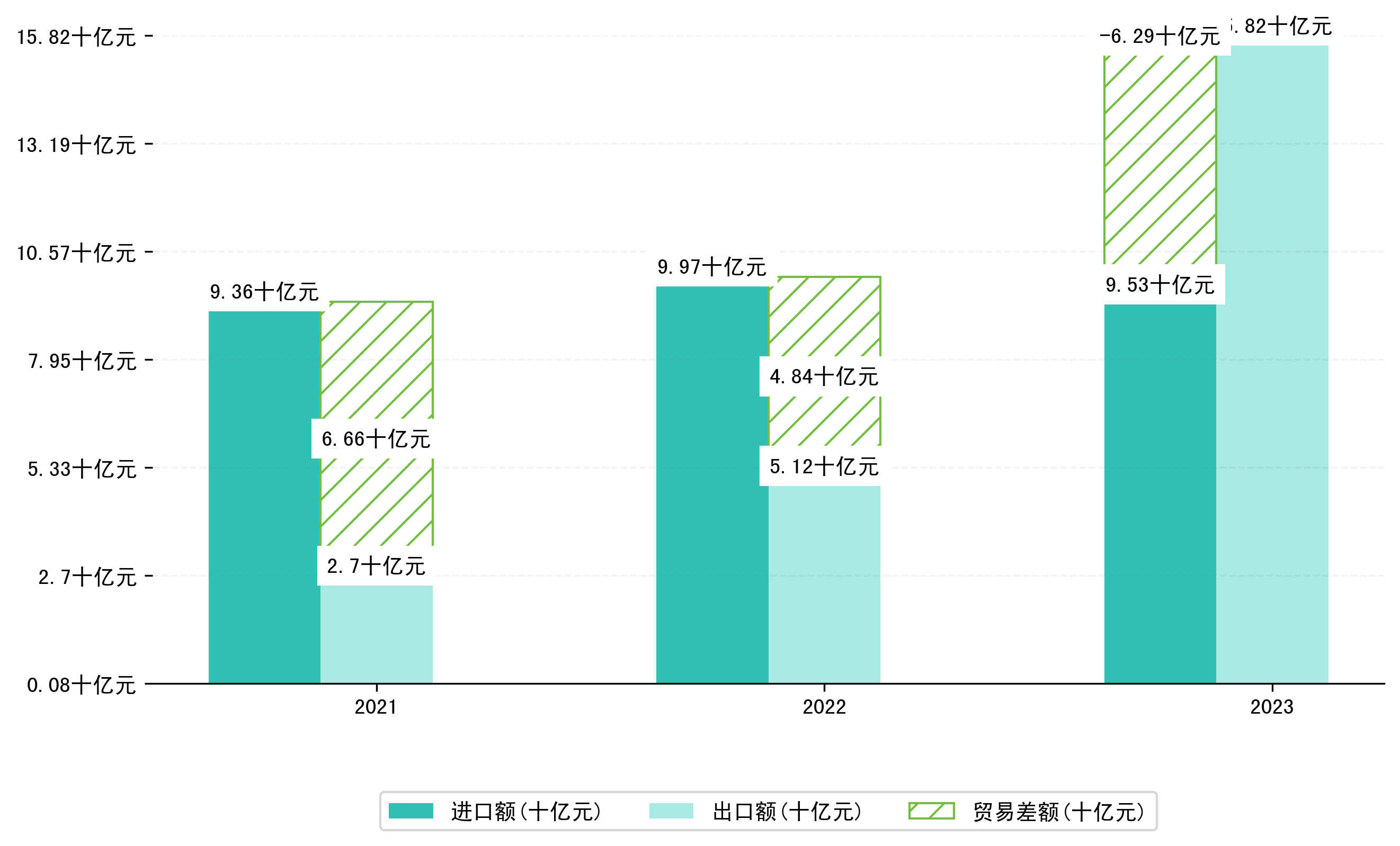 以人民币计,2023年12月满洲里市贸易差额为3,1667,0930万元(贸易顺差),相比上月减少了2,1639,4794万元,即2914,9427万美元;相比上年同期减少了8000,5038万元,同比减少-20.17%。