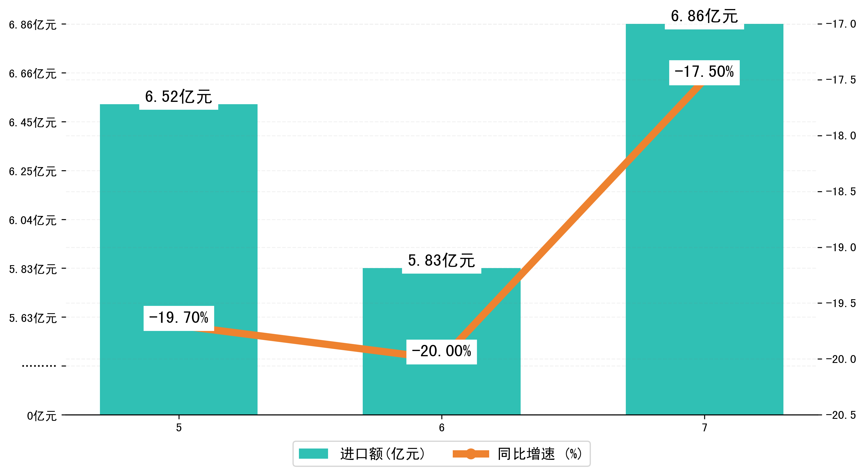 以美元计,2024年1-7月满洲里市进口额为6,3940.2618万美元,相比上年同期减少了1,5175.9431万美元,同比减少-19.20%。