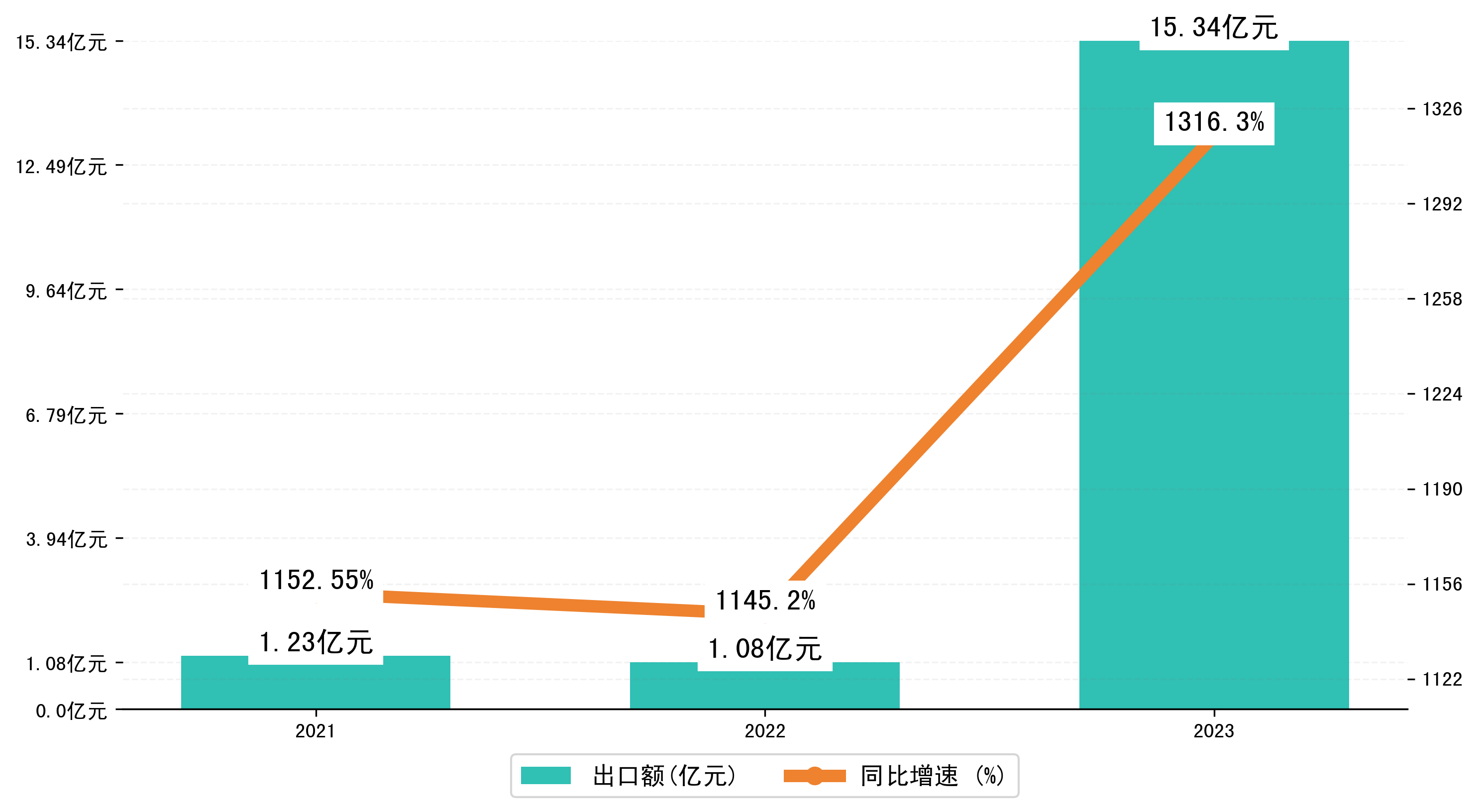 以人民币计,2023年1-1月满洲里市出口额为15,3438.8409万元,相比上年同期增加了14,2605.0322万元,同比增加了1394.50%。