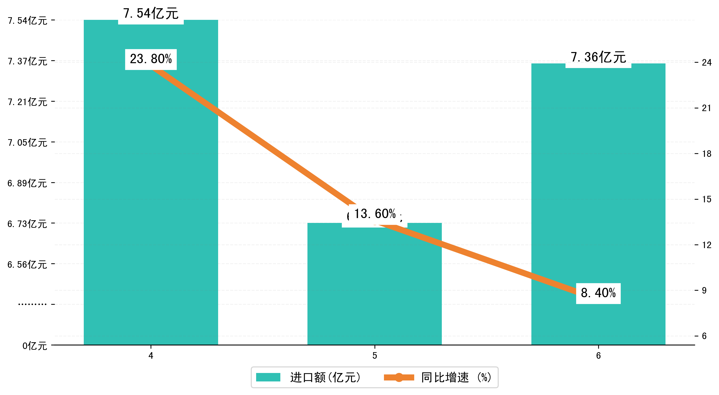 以美元计,2023年1-6月满洲里市进口额为6,9607.8633万美元,相比上年同期增加了795.944万美元,同比增加0.60%。