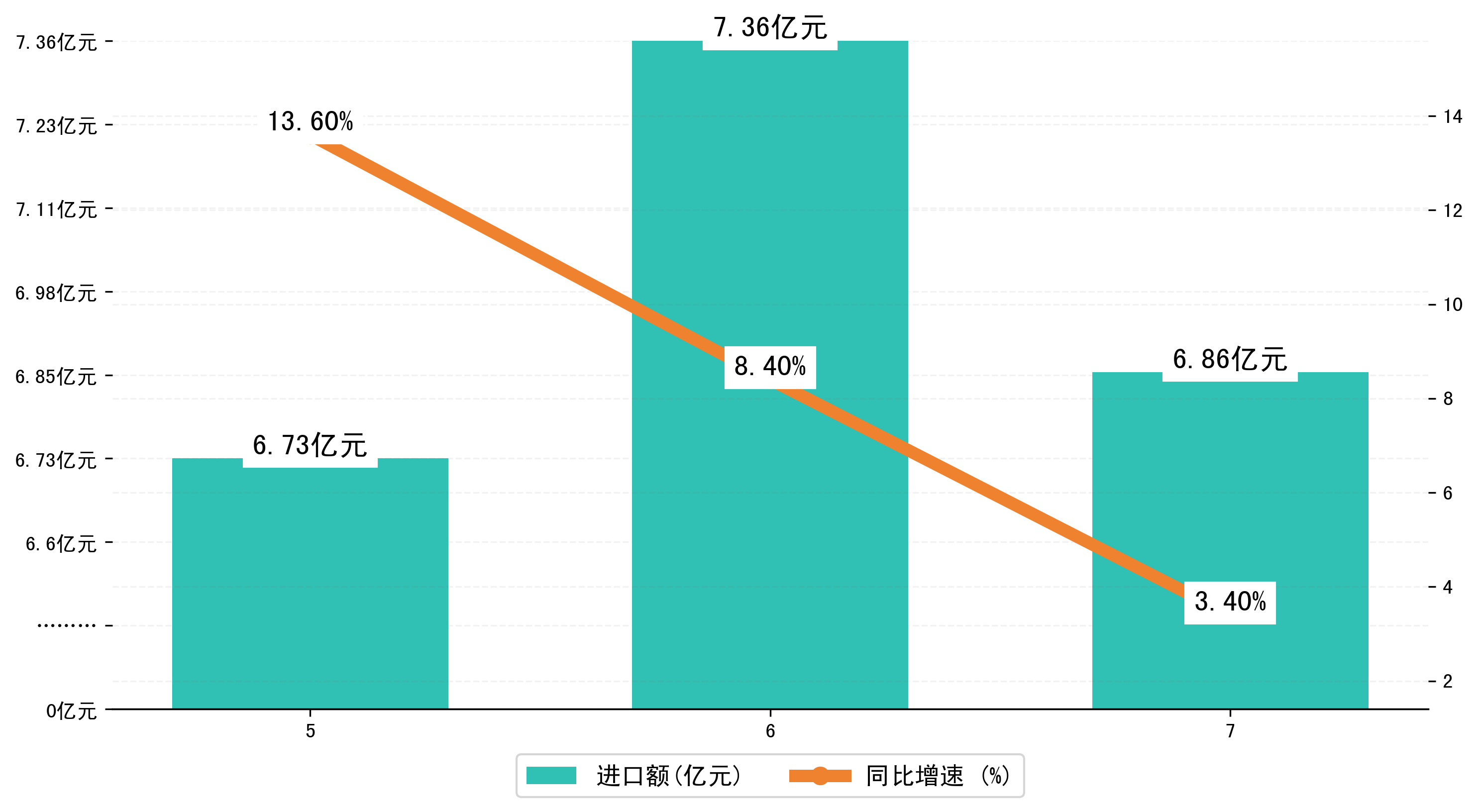 以人民币计,2023年7月满洲里市进口额为6,8576.5857万元,相比上月减少了5033.4153万元;相比上年同期减少了1,8177.7231万元,同比增加了3.40%。