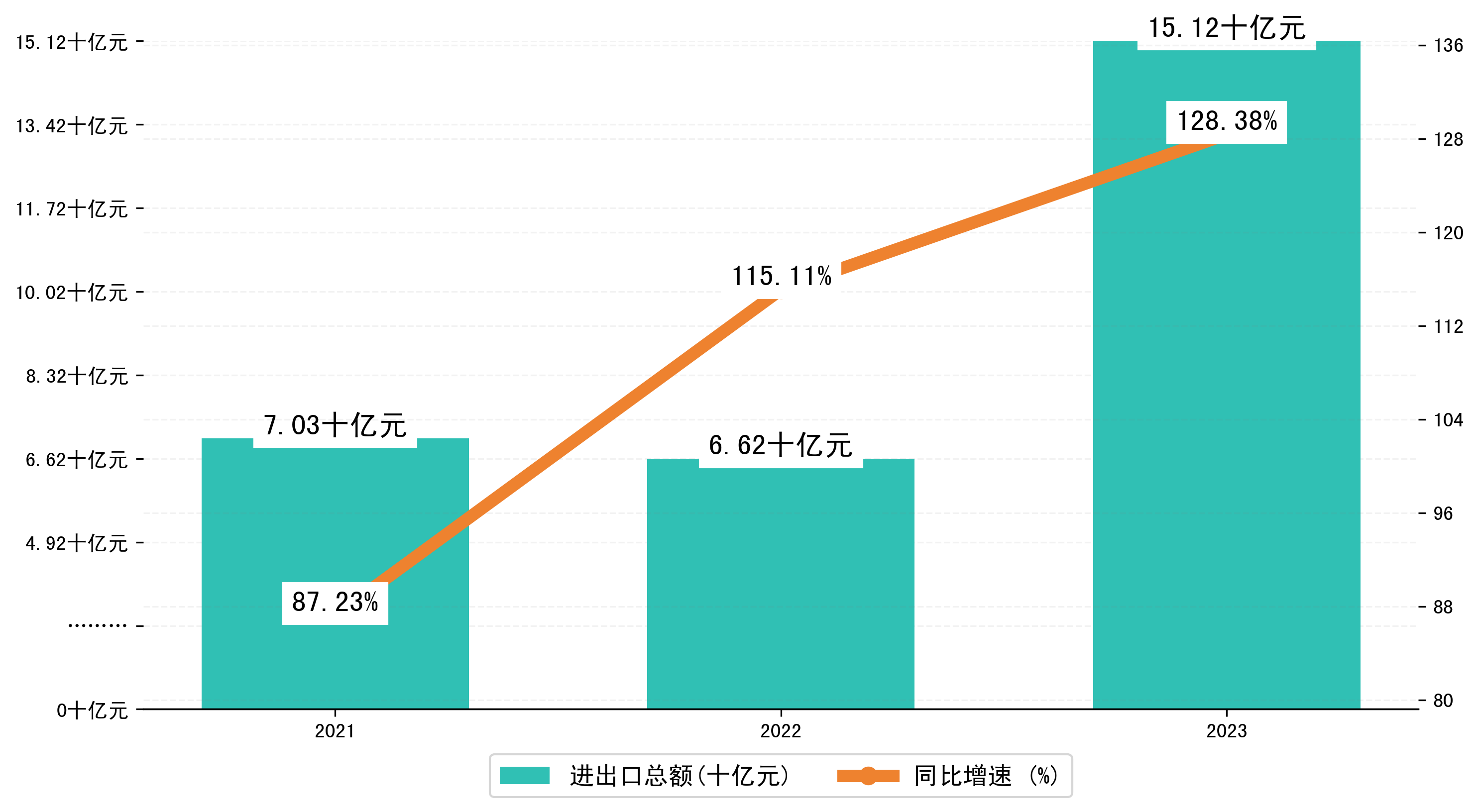 以人民币计,2023年1-7月满洲里市进出口总额为151,2388.9492万元,相比上年同期增加了85,0161.6867万元,同比增加了127.90%。