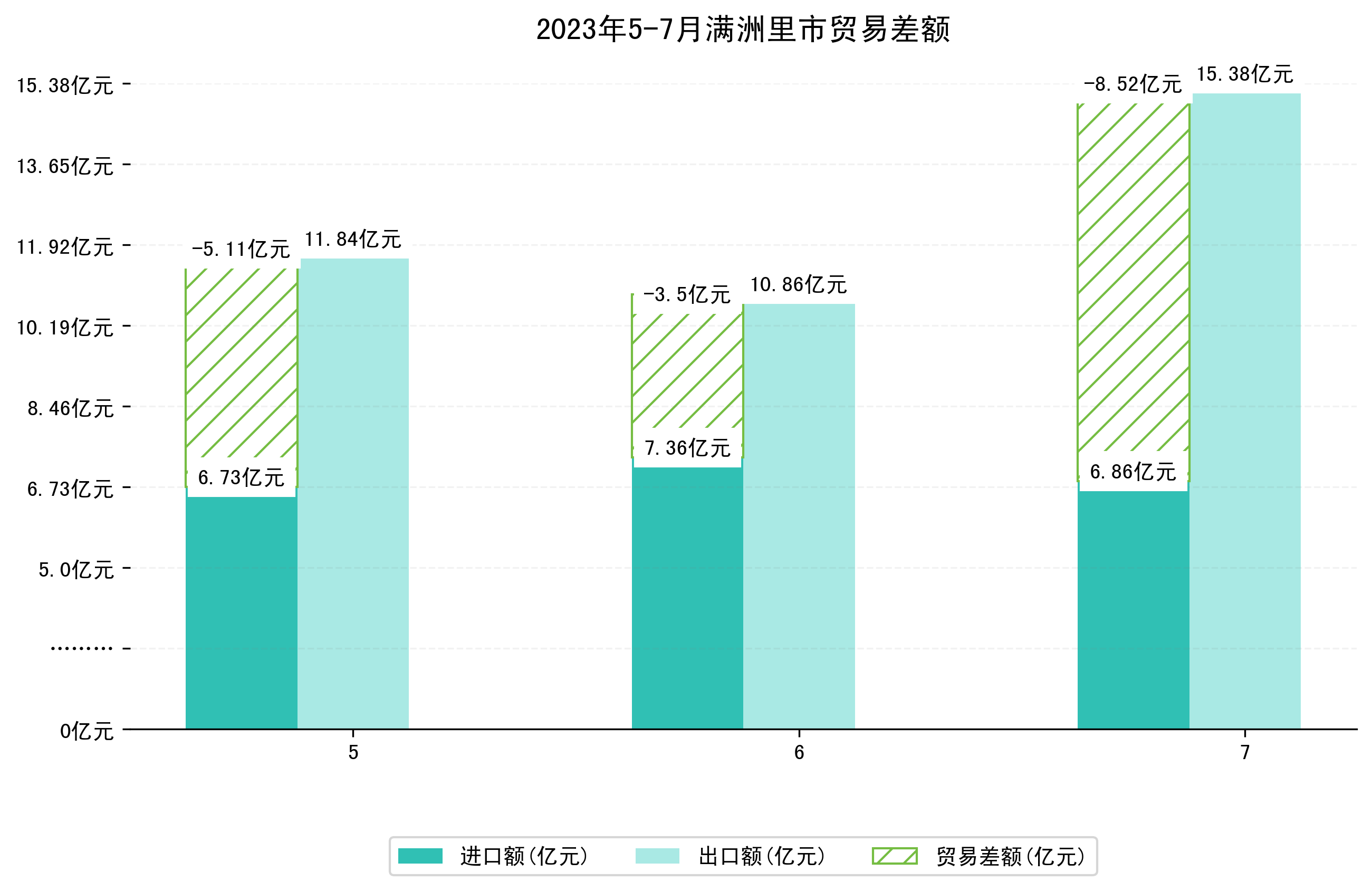 以美元计,2023年1-7月满洲里市贸易差额为5,9203,2189万美元(贸易顺差),相比上年同期增加了12,1032,4447万美元,同比增加-195.75%。