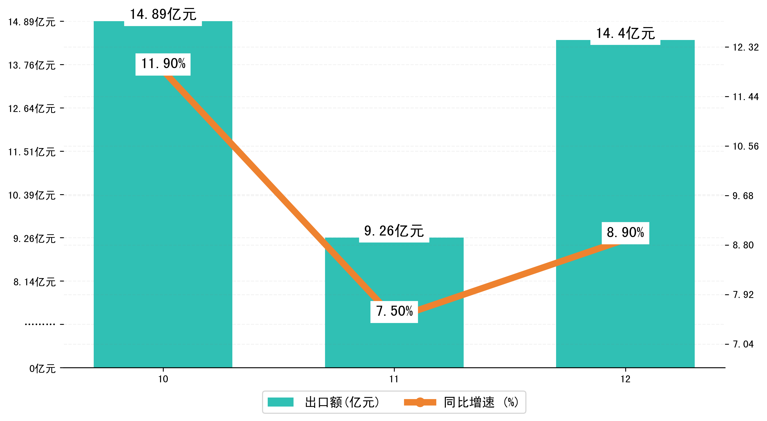 以人民币计,2024年12月满洲里市出口额为14,3961.7478万元,相比上月增加了5,1318.1007万元;相比上年同期增加了3,1226.3079万元,同比增加了8.90%。