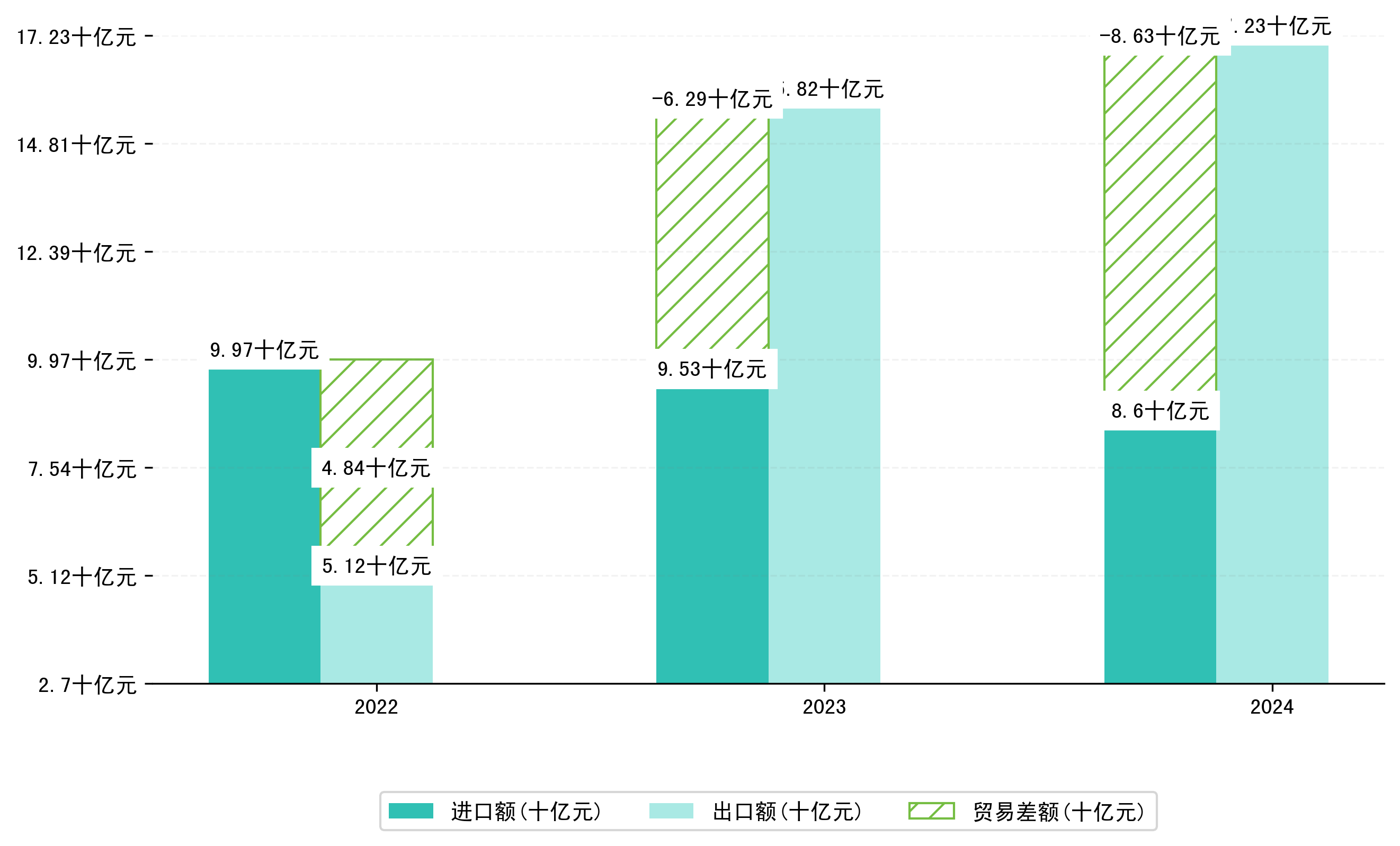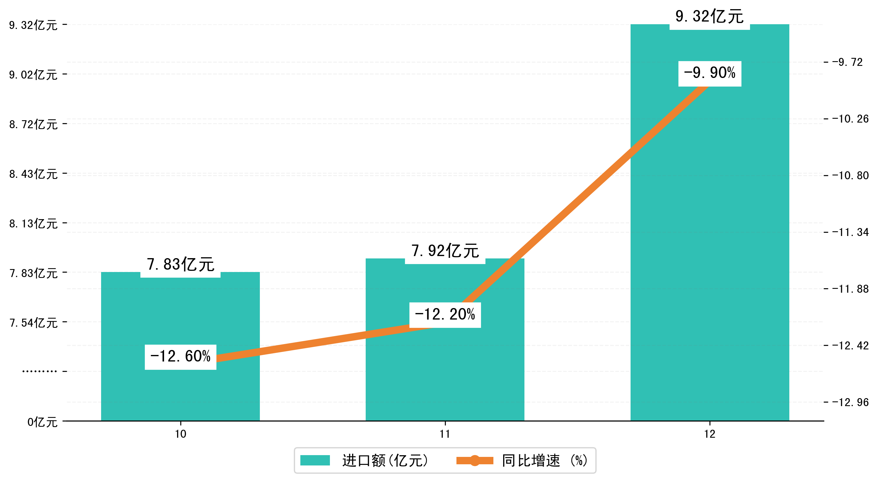 以人民币计,2024年1-12月满洲里市进口额为86,0088.4941万元,相比上年同期减少了9,3105.4945万元,同比减少了-9.90%。