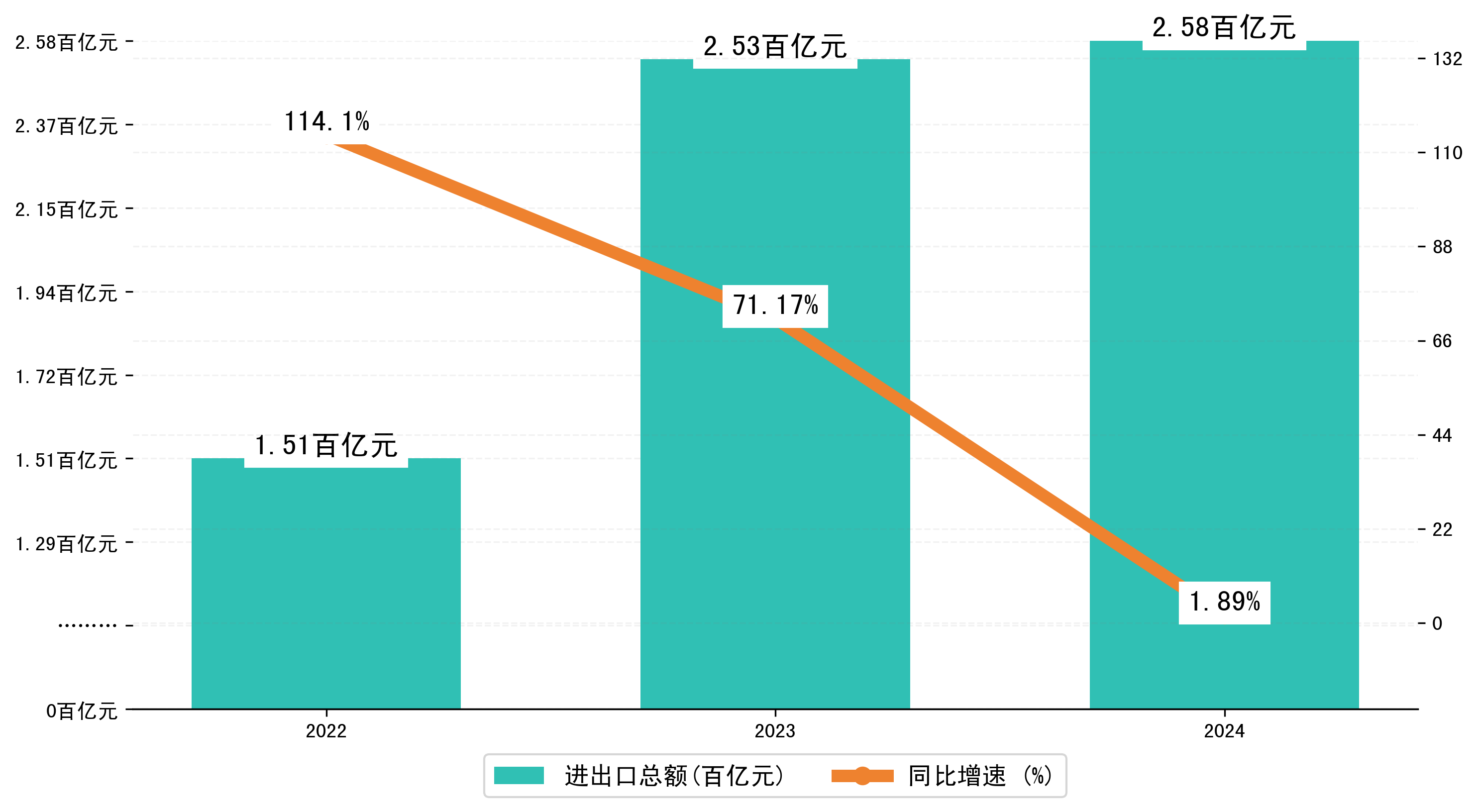 以人民币计,2024年1-12月满洲里市进出口总额为258,2914.7894万元,相比上年同期增加了4,7982.3443万元,同比增加了1.80%。