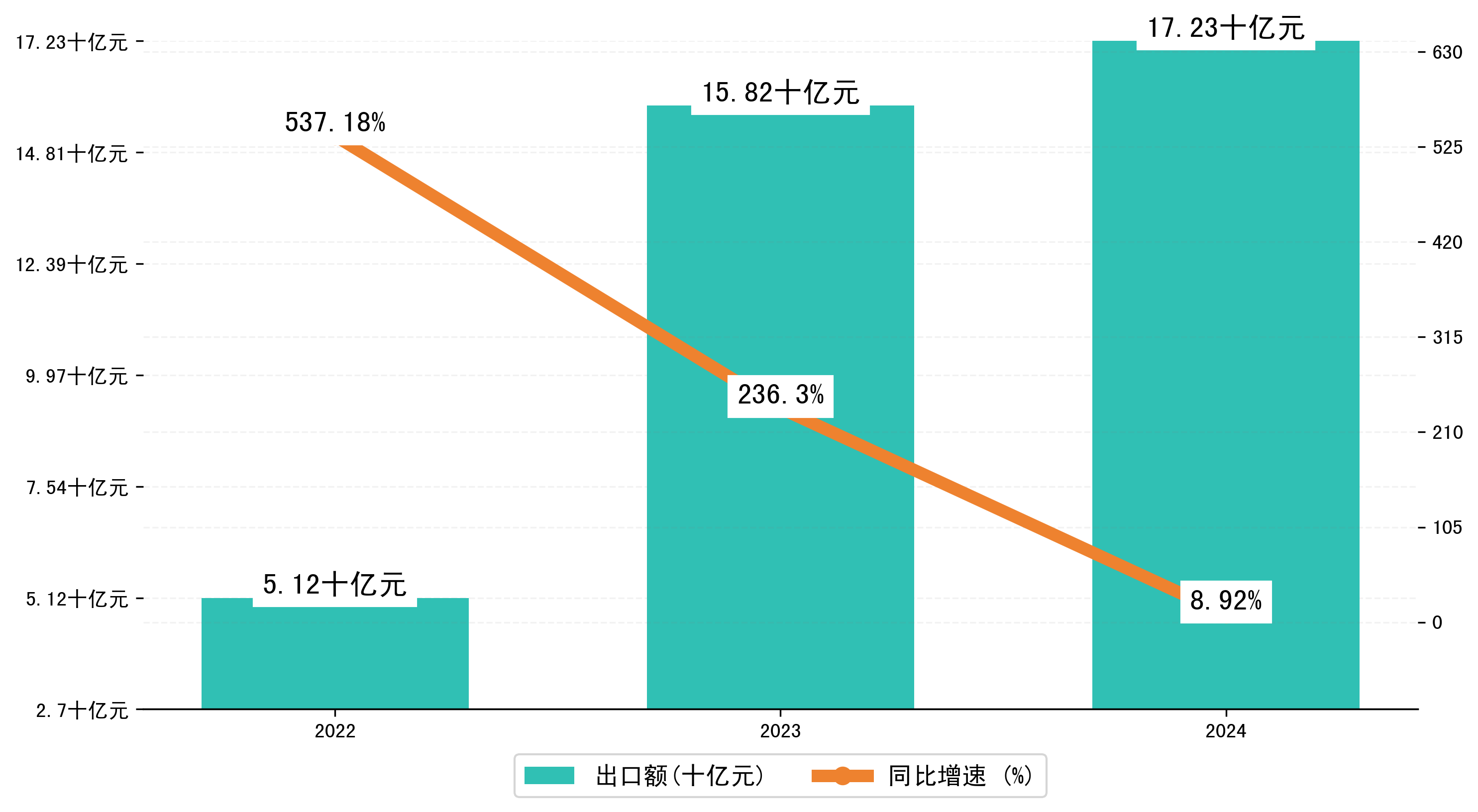 以人民币计,2024年1-12月满洲里市出口额为172,2826.2953万元,相比上年同期增加了14,1087.8388万元,同比增加了8.90%。