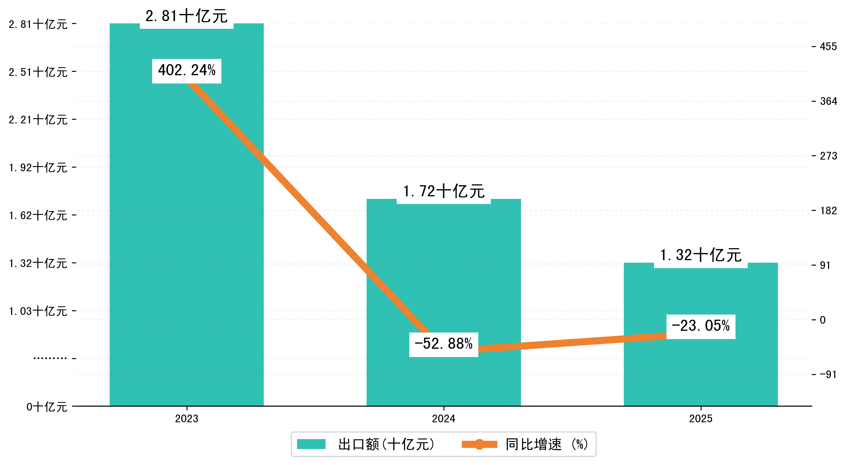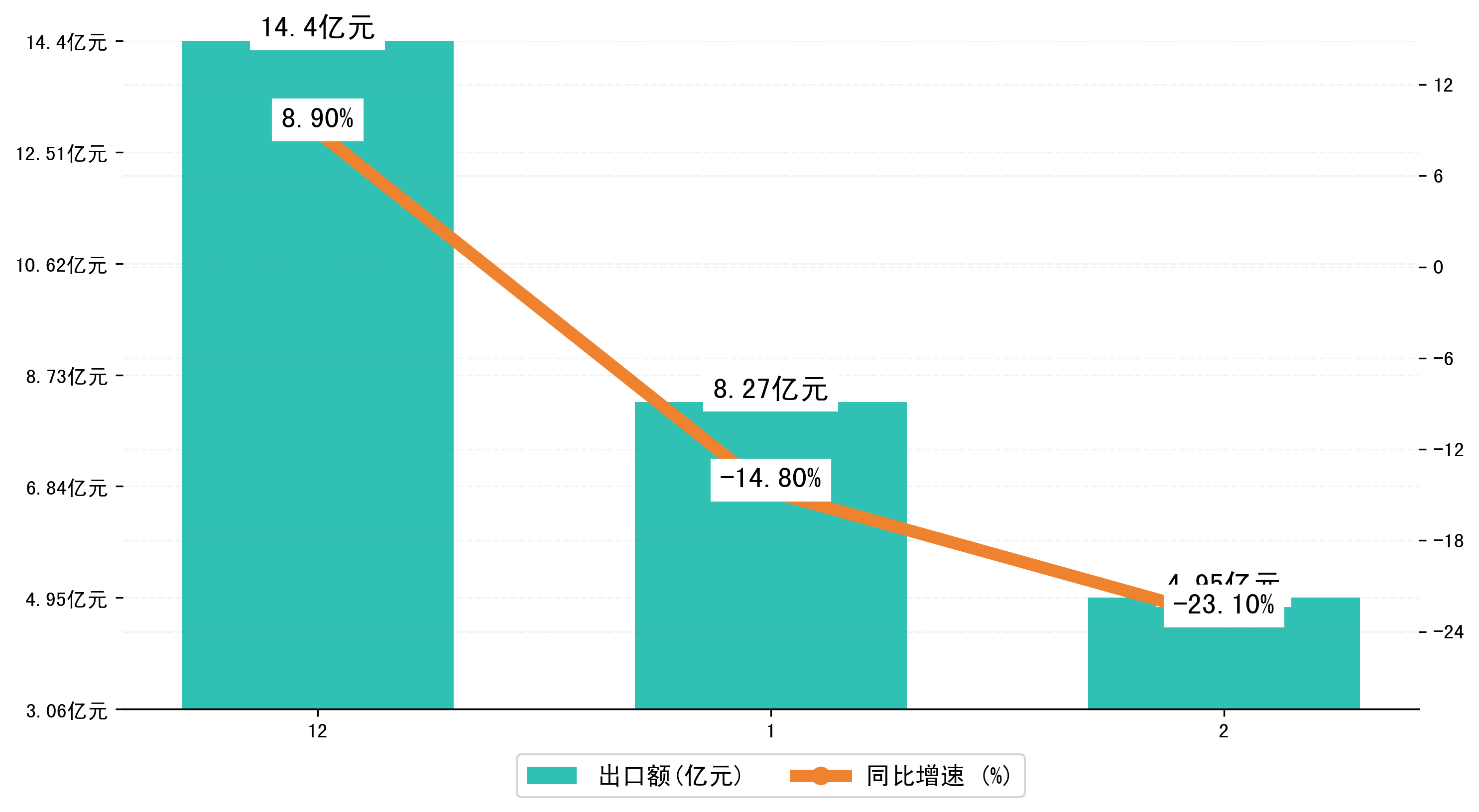 以人民币计,2025年1-2月满洲里市出口额为13,2246.4433万元,相比上年同期减少了3,9619.5024万元,同比减少了-23.10%。