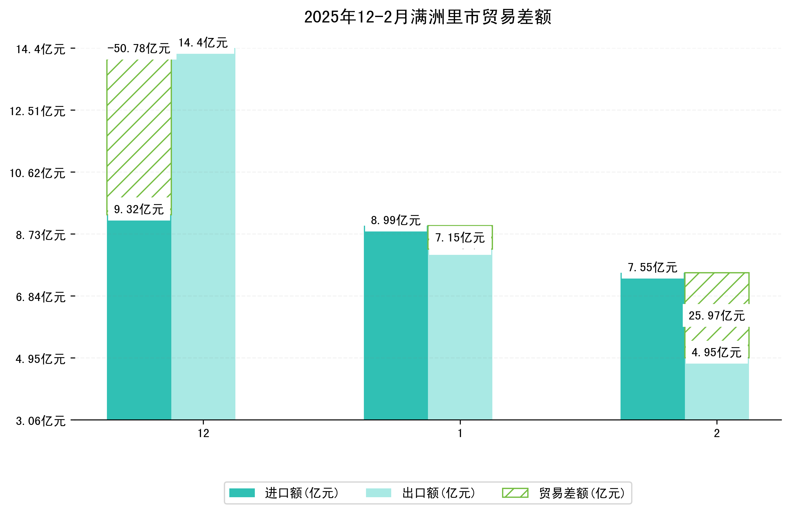 以人民币计,2025年2月满洲里市贸易差额为2,5970,5657万元(贸易逆差),相比上月减少了1,8822,1220万元,即2726,6479万美元;相比上年同期减少了4,3606,8614万元,同比减少-247.26%。
