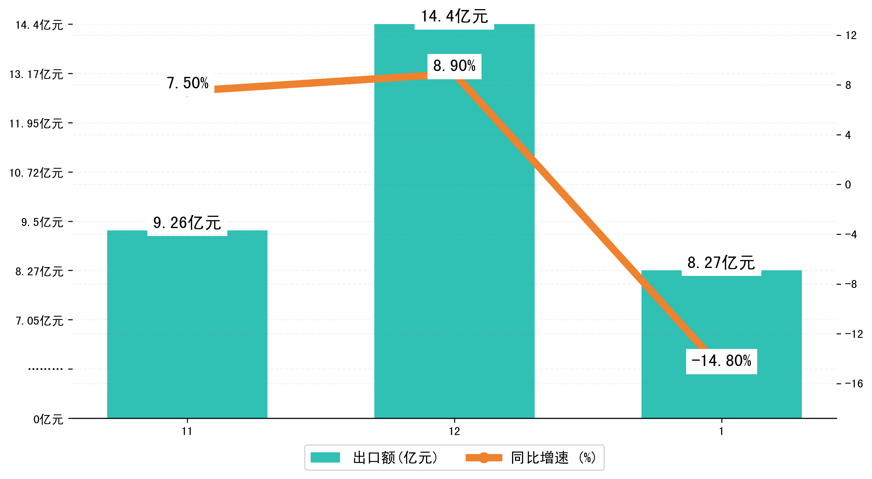 以人民币计,2025年1-1月满洲里市出口额为8,2713.7271万元,相比上年同期减少了1,4416.7307万元,同比减少了-14.80%。