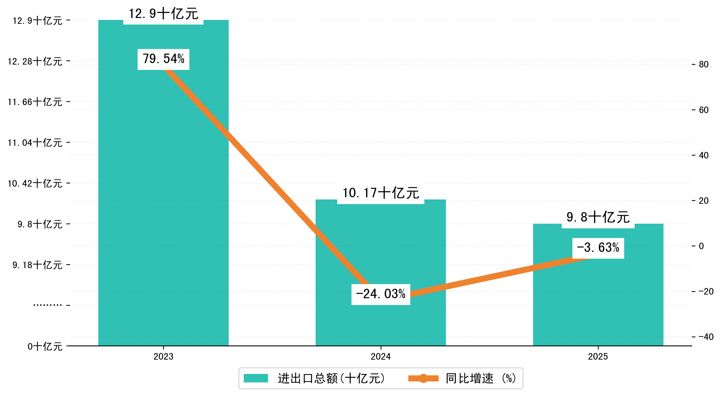 以美元计,2025年1-6月满洲里市进出口总额为13,6436.98万美元,相比上年同期减少了6815.3594万美元,同比减少-5.00%。