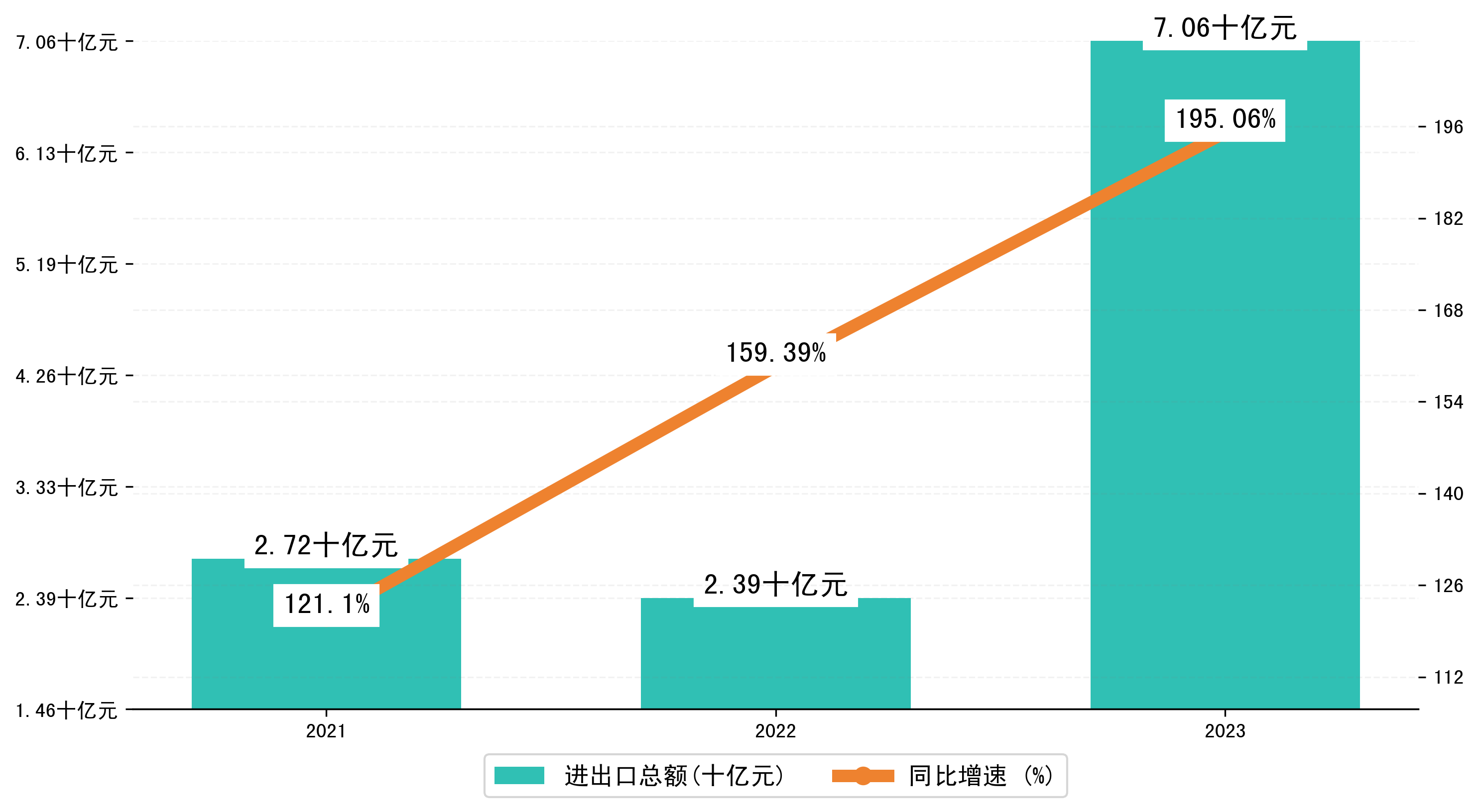 以美元计,2023年1-3月满洲里市进出口总额为10,2416.2394万美元,相比上年同期增加了6,4968.6326万美元,同比增加171.30%。