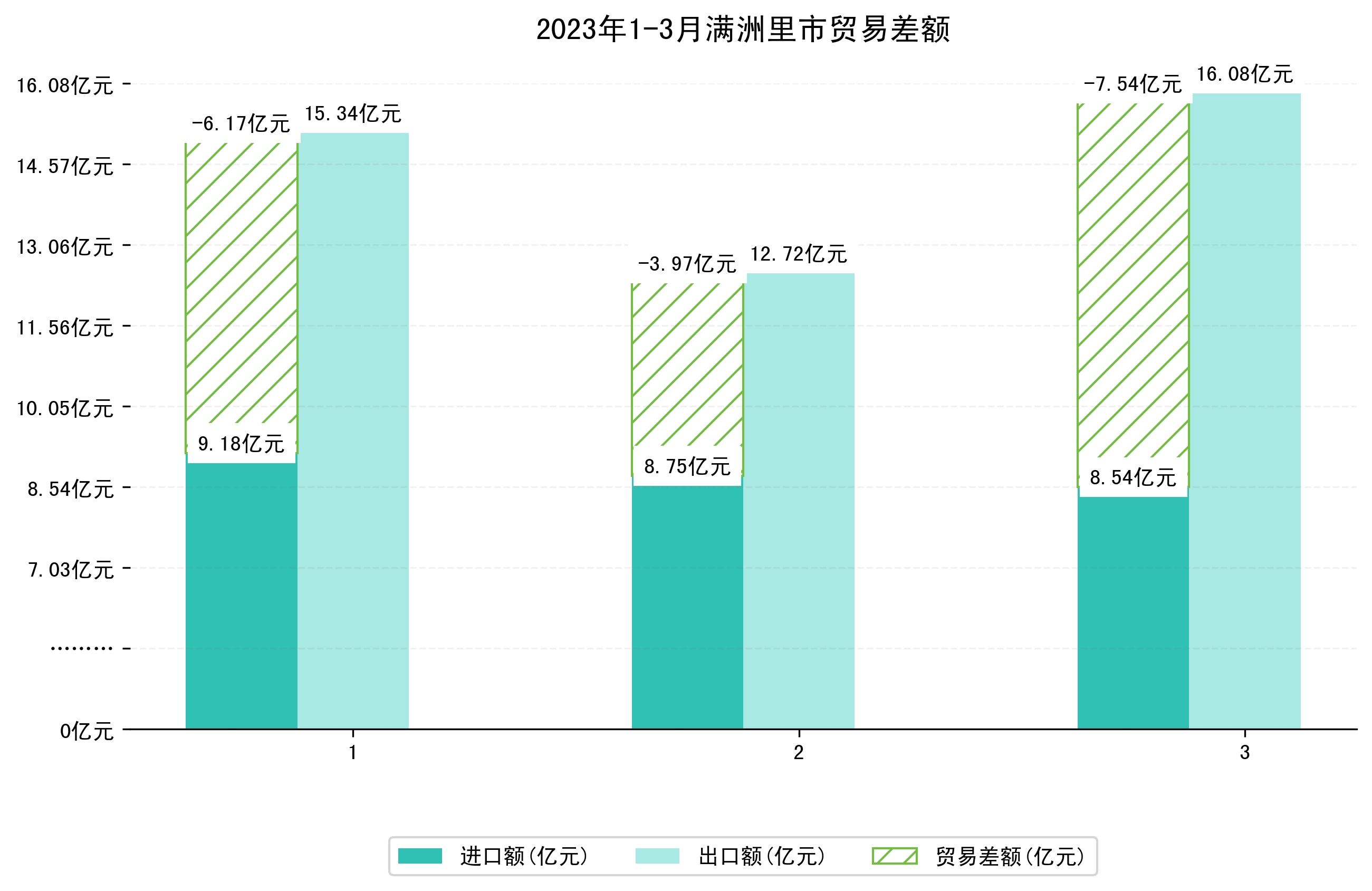 以人民币计,2023年1-3月满洲里市贸易差额为17,6638,0519万元(贸易顺差),相比上年同期增加了33,6367,7073万元,同比增加-210.59%。