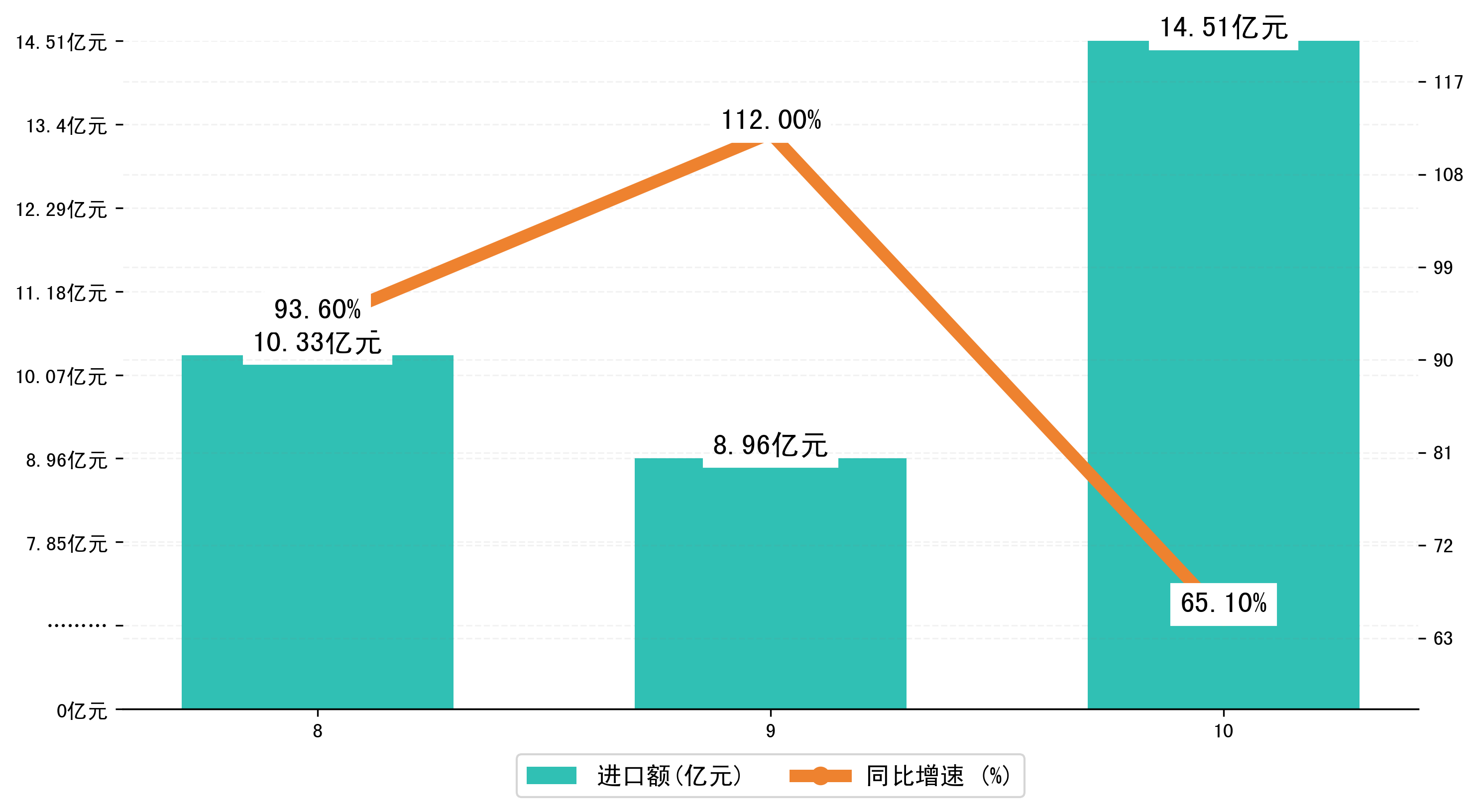 以人民币计,2024年10月茂名市进口额为14,5128.6504万元,相比上月增加了5,5506.049万元;相比上年同期减少了4,0098.8451万元,同比增加了65.10%。