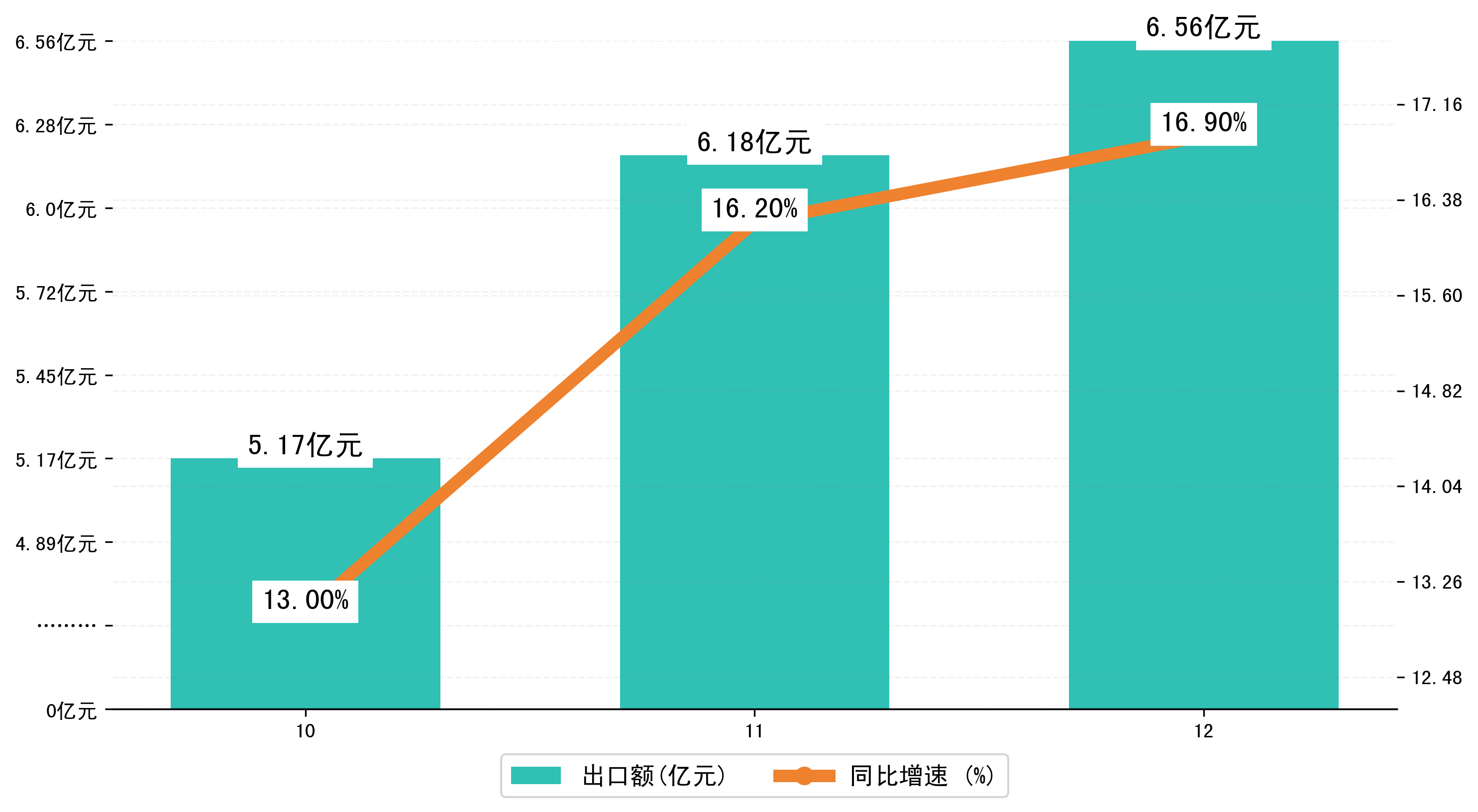 以人民币计,2024年12月茂名市出口额为6,5618.1329万元,相比上月增加了3835.0491万元;相比上年同期增加了1,1969.6238万元,同比增加了16.90%。