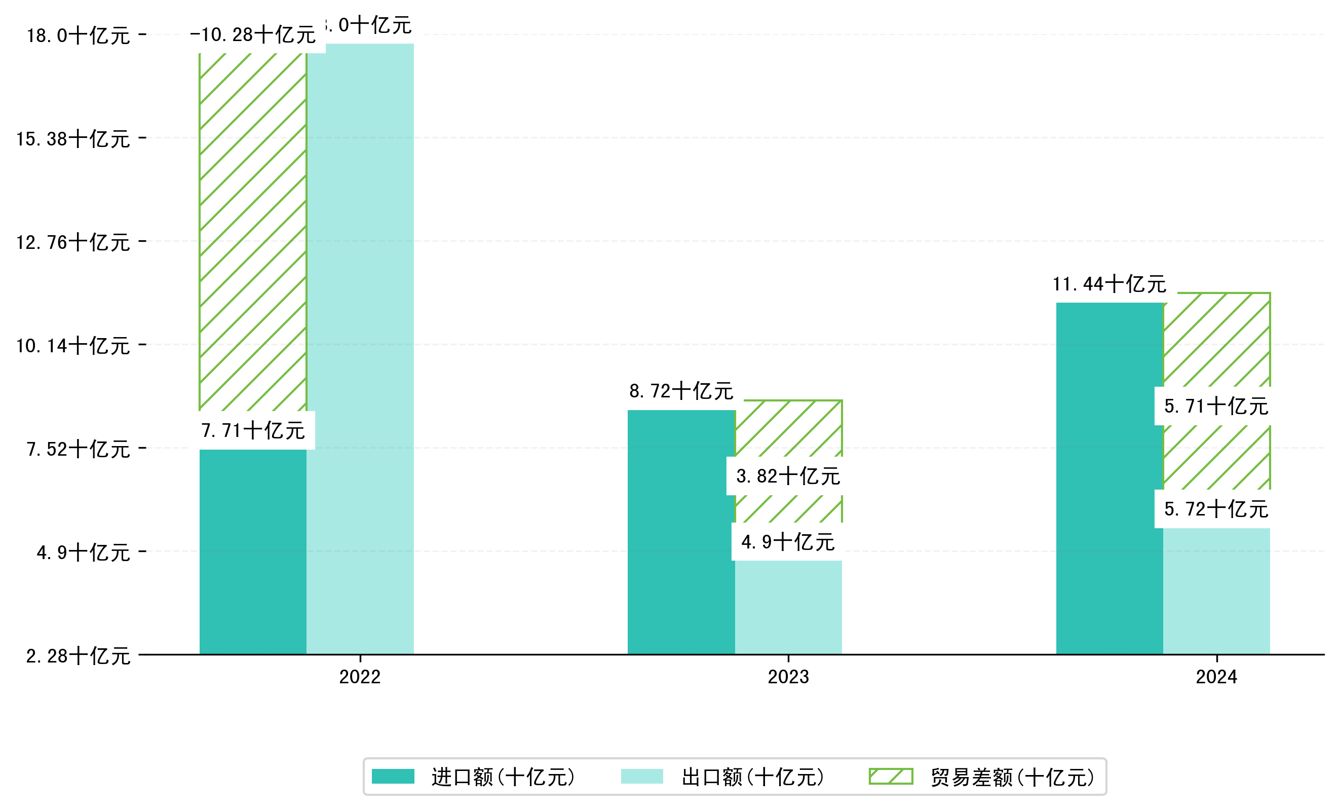 以人民币计,2024年1-12月茂名市贸易差额为57,1334,5481万元(贸易逆差),相比上年同期减少了18,9390,5355万元,同比减少49.59%。