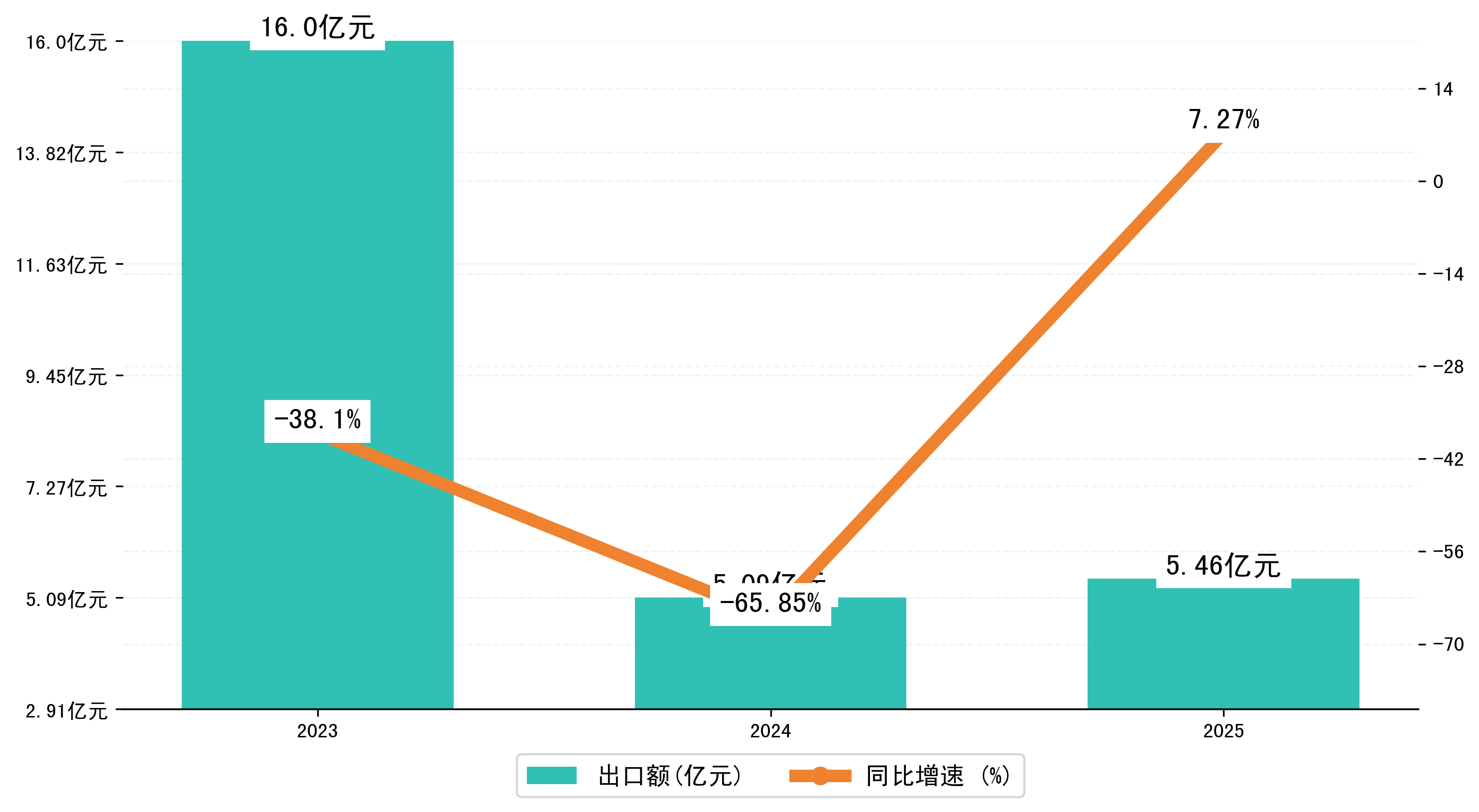 以美元计,2025年1-1月茂名市出口额为7597.063万美元,相比上年同期增加了443.6746万美元,同比增加6.20%。