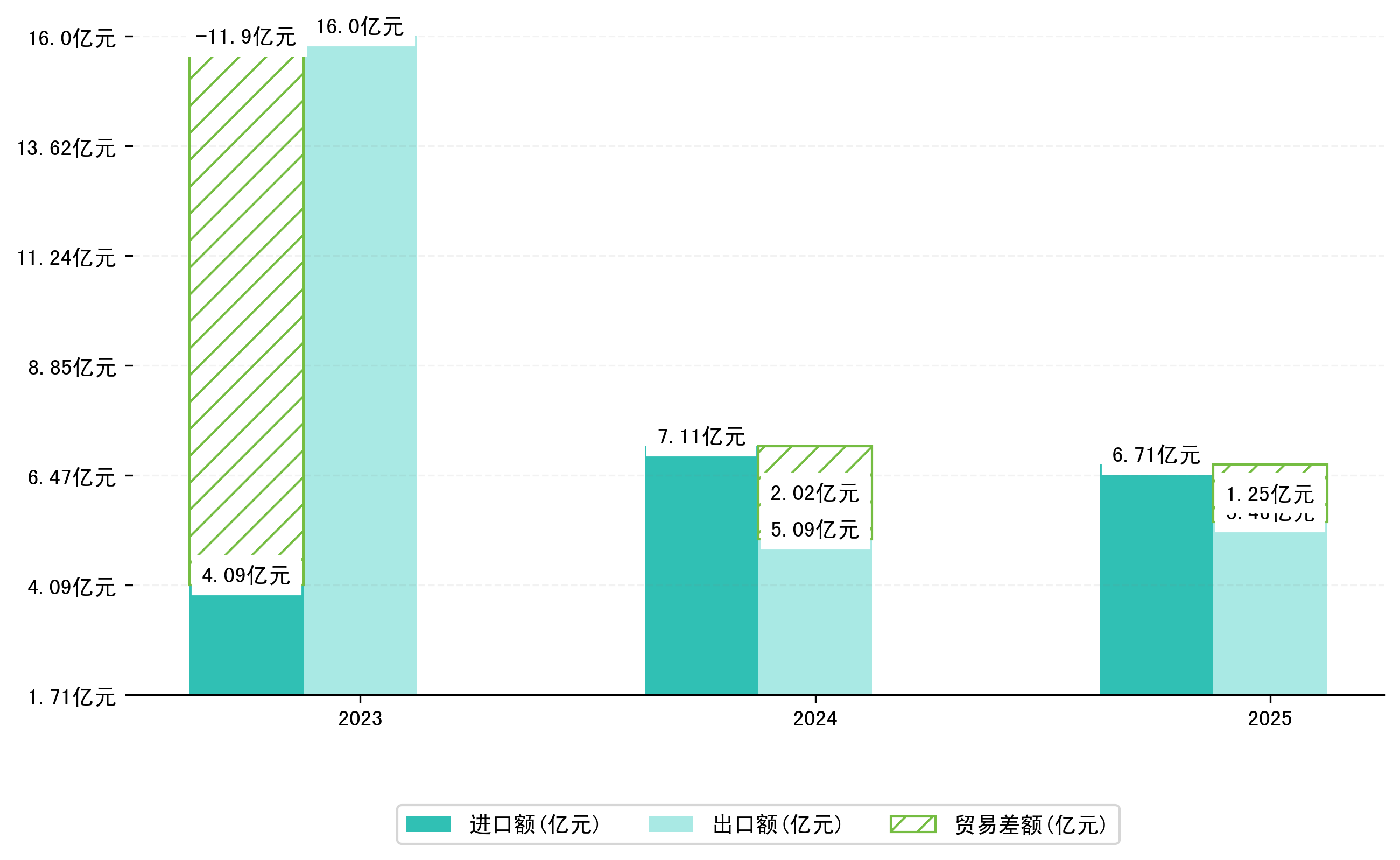 以人民币计,2025年1-1月茂名市贸易差额为1,2465,4263万元(贸易逆差),相比上年同期增加了7722,9987万元,同比增加-38.25%。