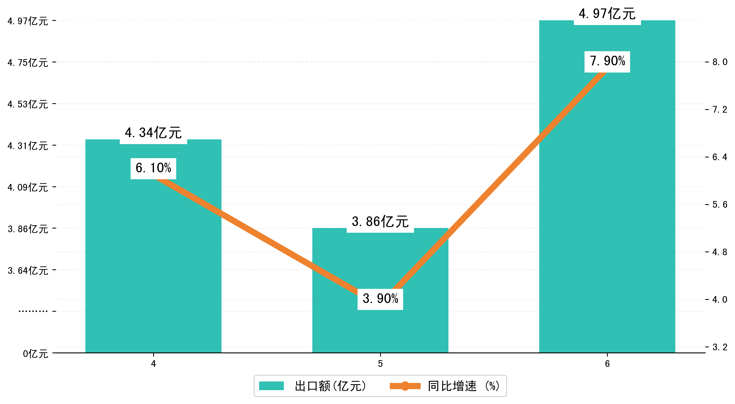 以美元计,2025年1-6月茂名市出口额为3,4998.0552万美元,相比上年同期增加了2209.5112万美元,同比增加6.70%。