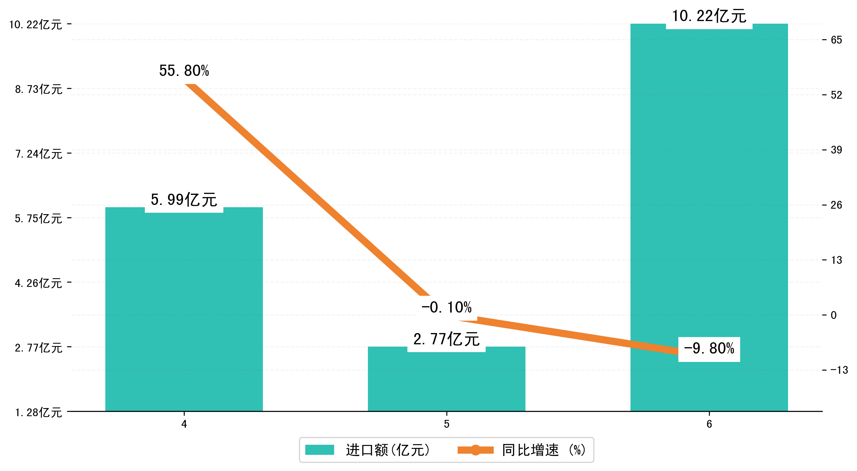 以人民币计,2025年6月茂名市进口额为10,2204.8857万元,相比上月增加了7,4466.1195万元;相比上年同期减少了4,6714.149万元,同比减少了-9.80%。