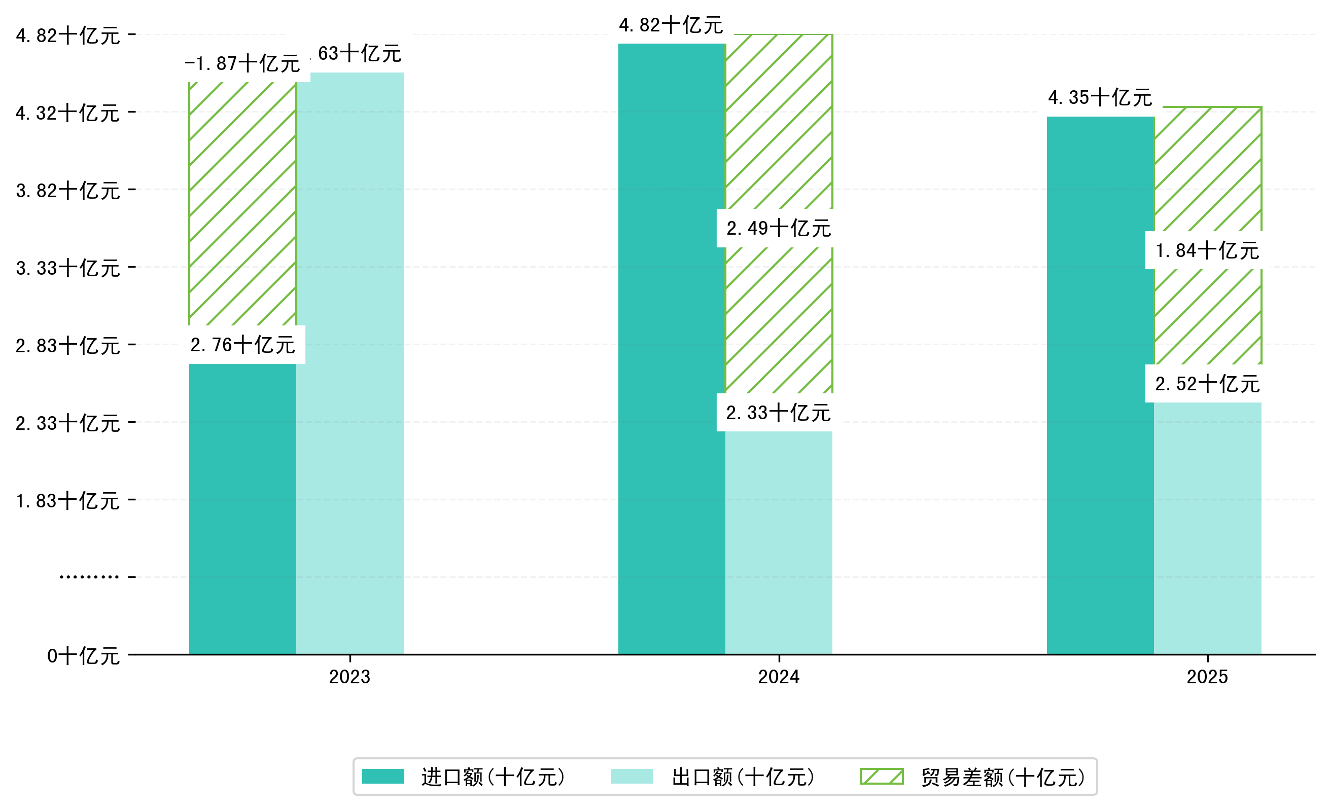 以人民币计,2025年6月茂名市贸易差额为5,2479,4132万元(贸易逆差),相比上月减少了6,3382,2904万元,即8819,7340万美元;相比上年同期增加了5,7588,1299万元,同比增加-52.32%。