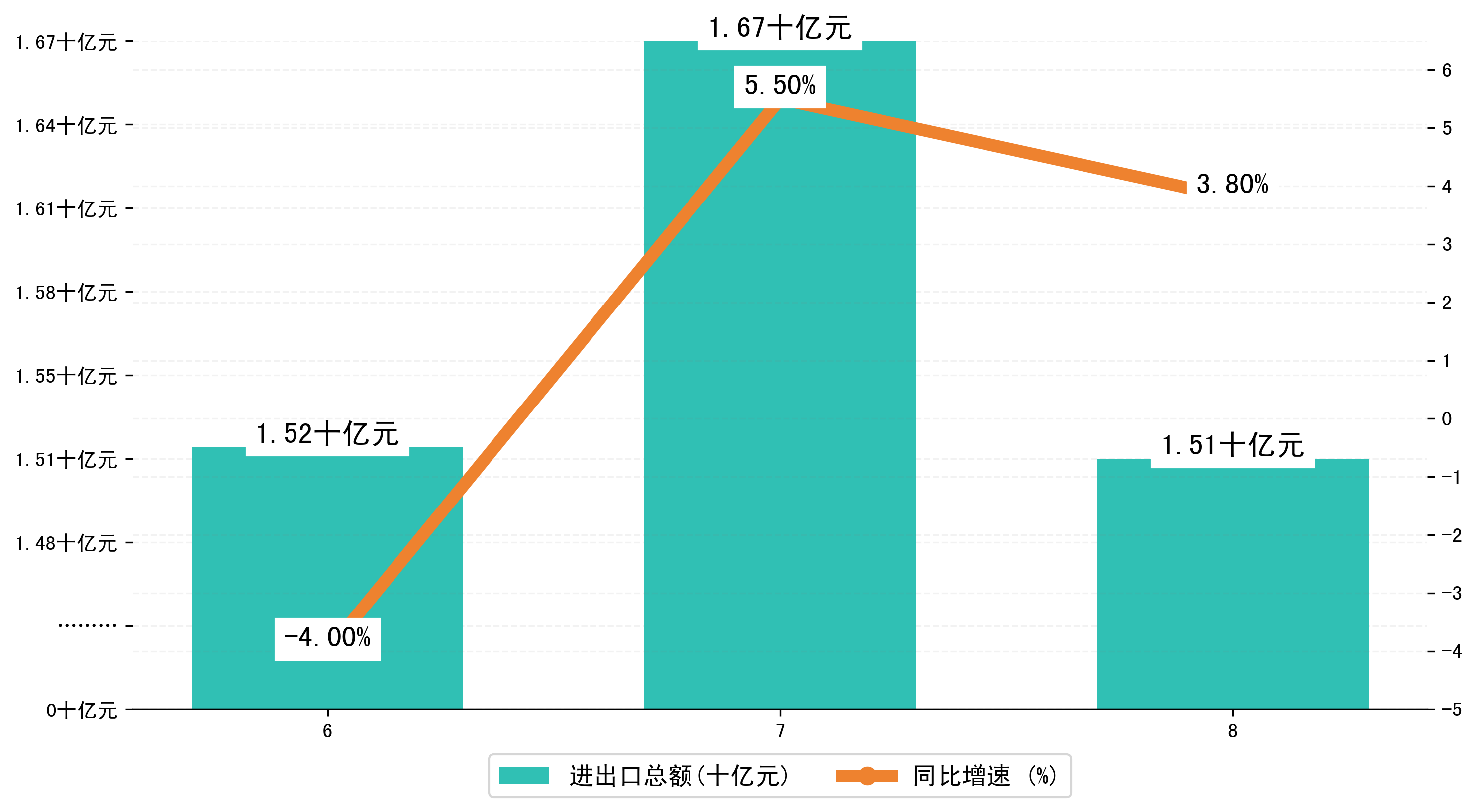 以人民币计,2025年1-8月茂名市进出口总额为100,5688.011万元,相比上年同期增加了3,8024.6993万元,同比增加了3.80%。
