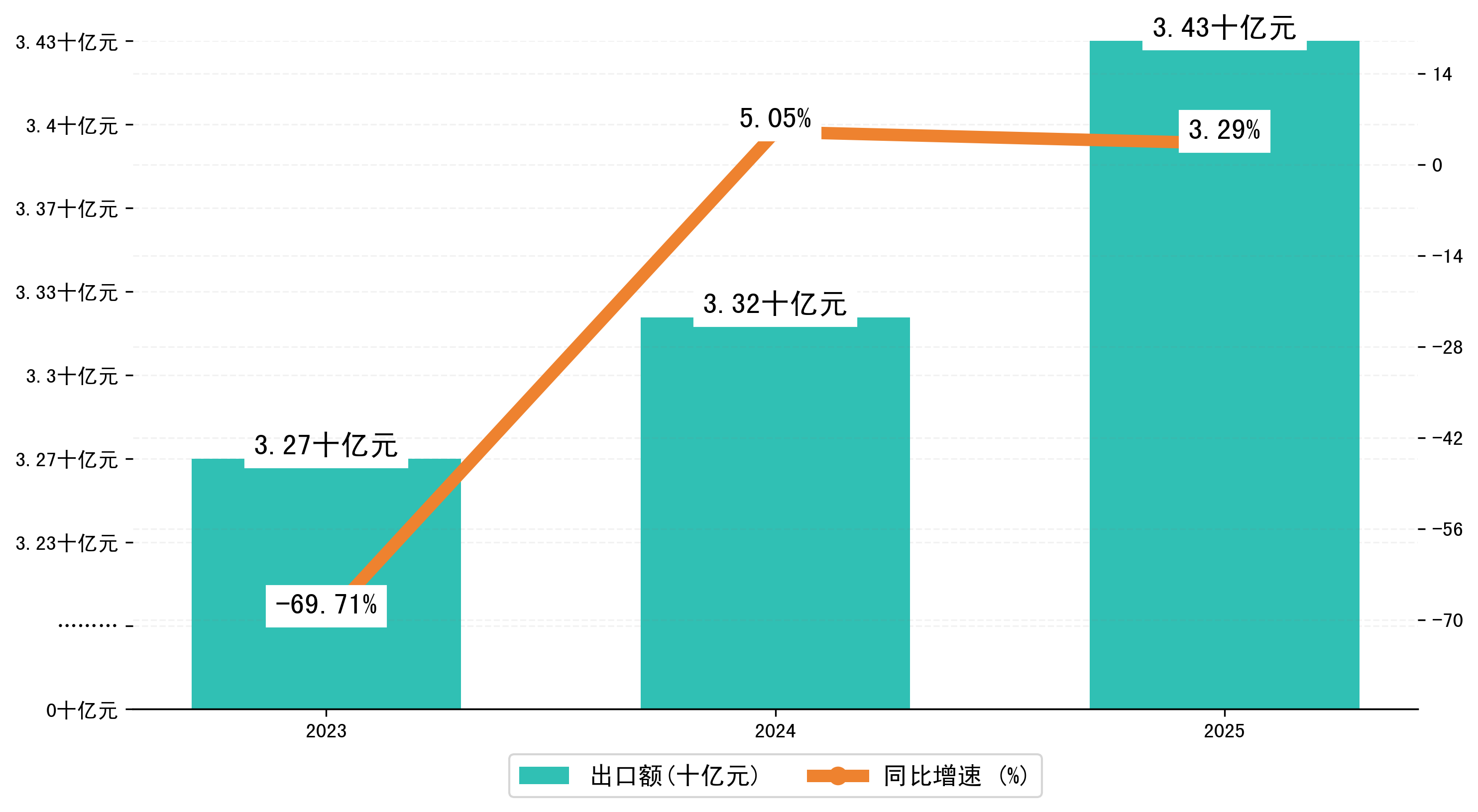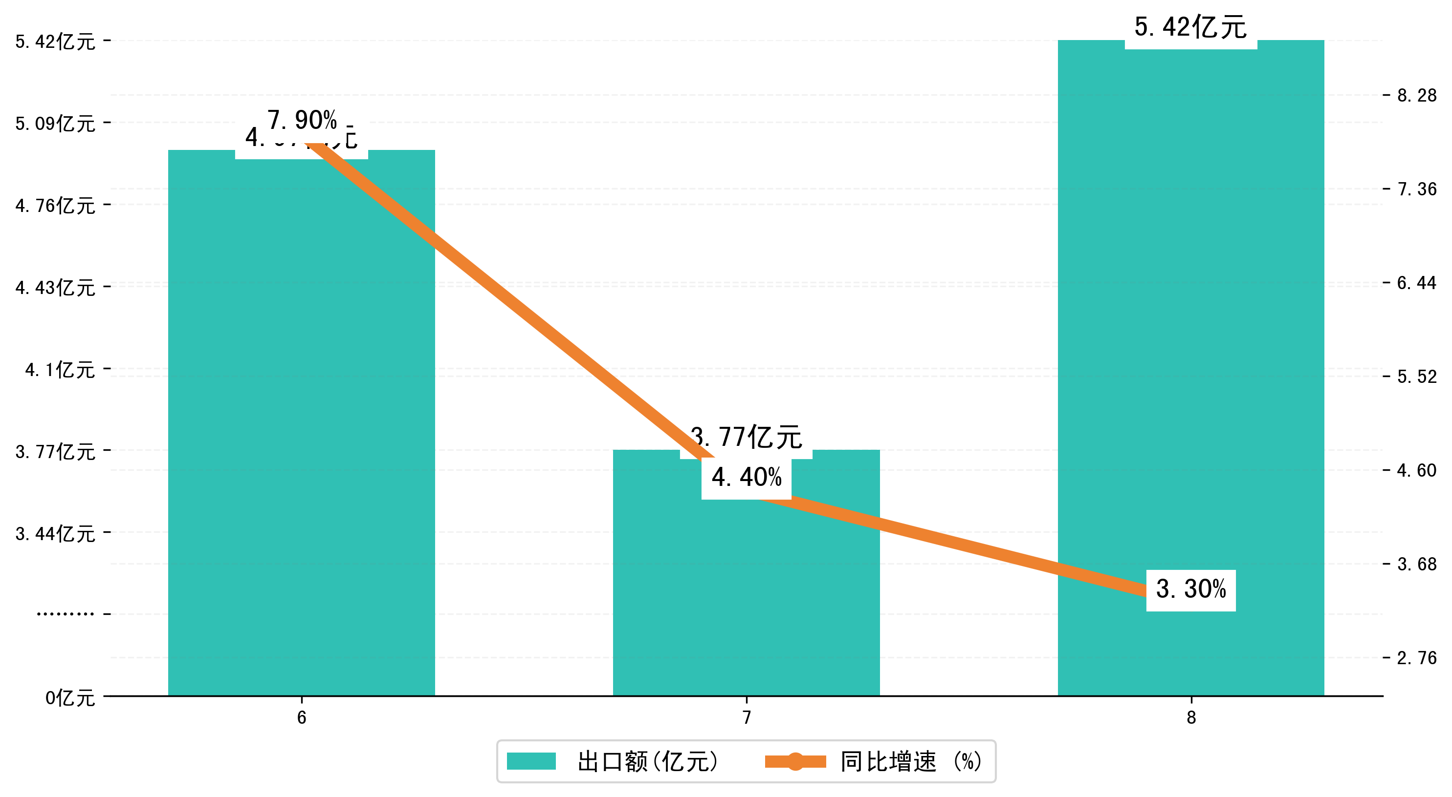 以人民币计,2025年1-8月茂名市出口额为34,3272.2408万元,相比上年同期增加了1,0922.3636万元,同比增加了3.30%。