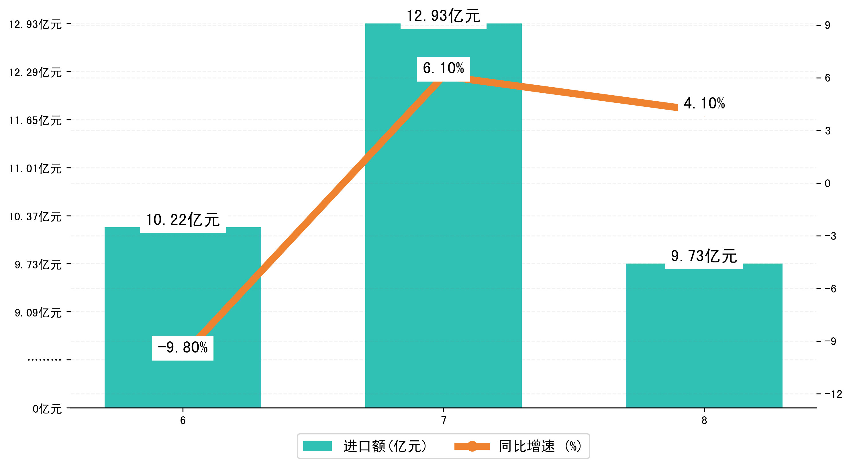以美元计,2025年1-8月茂名市进口额为9,2273.2294万美元,相比上年同期增加了2892.4131万美元,同比增加3.10%。