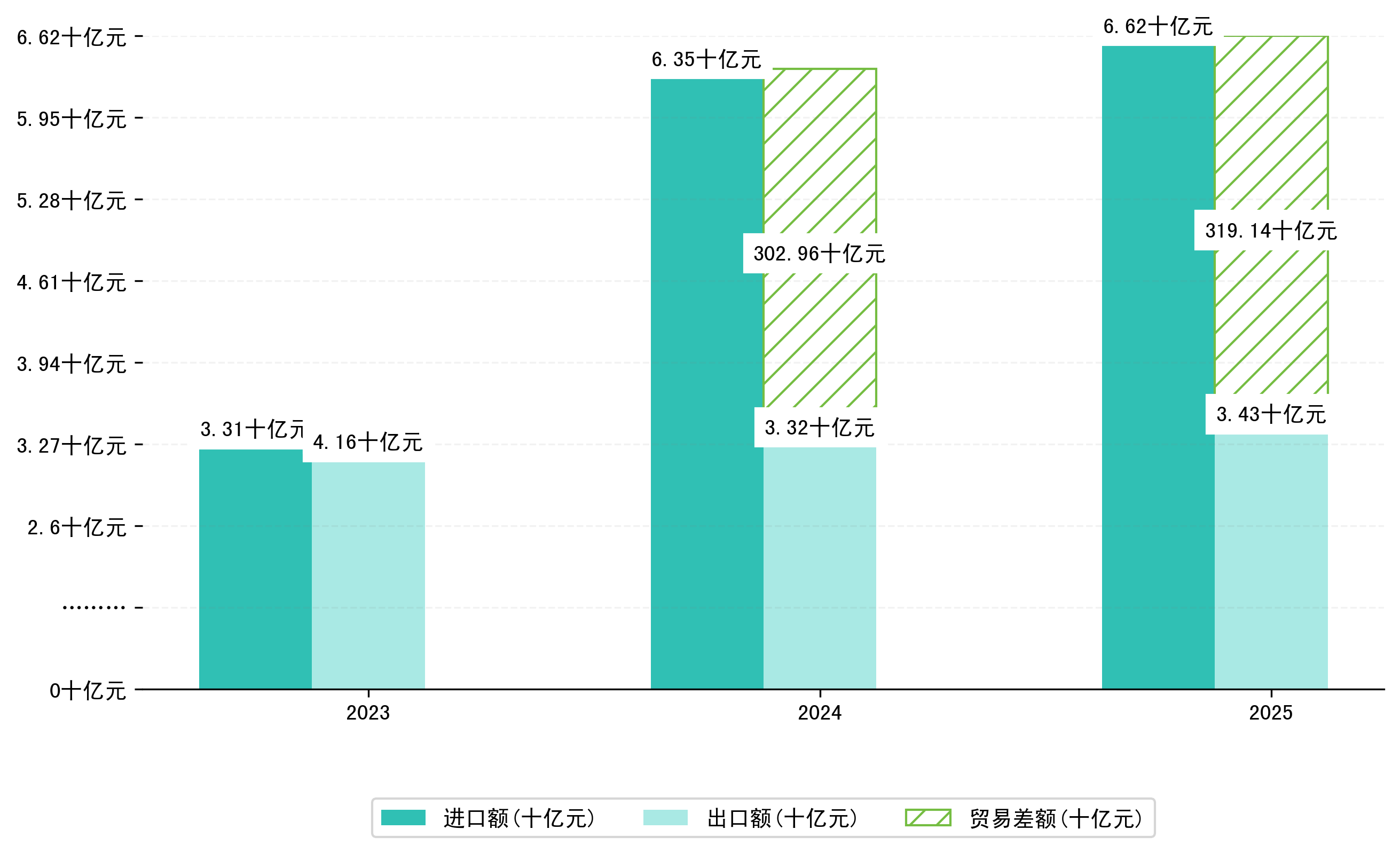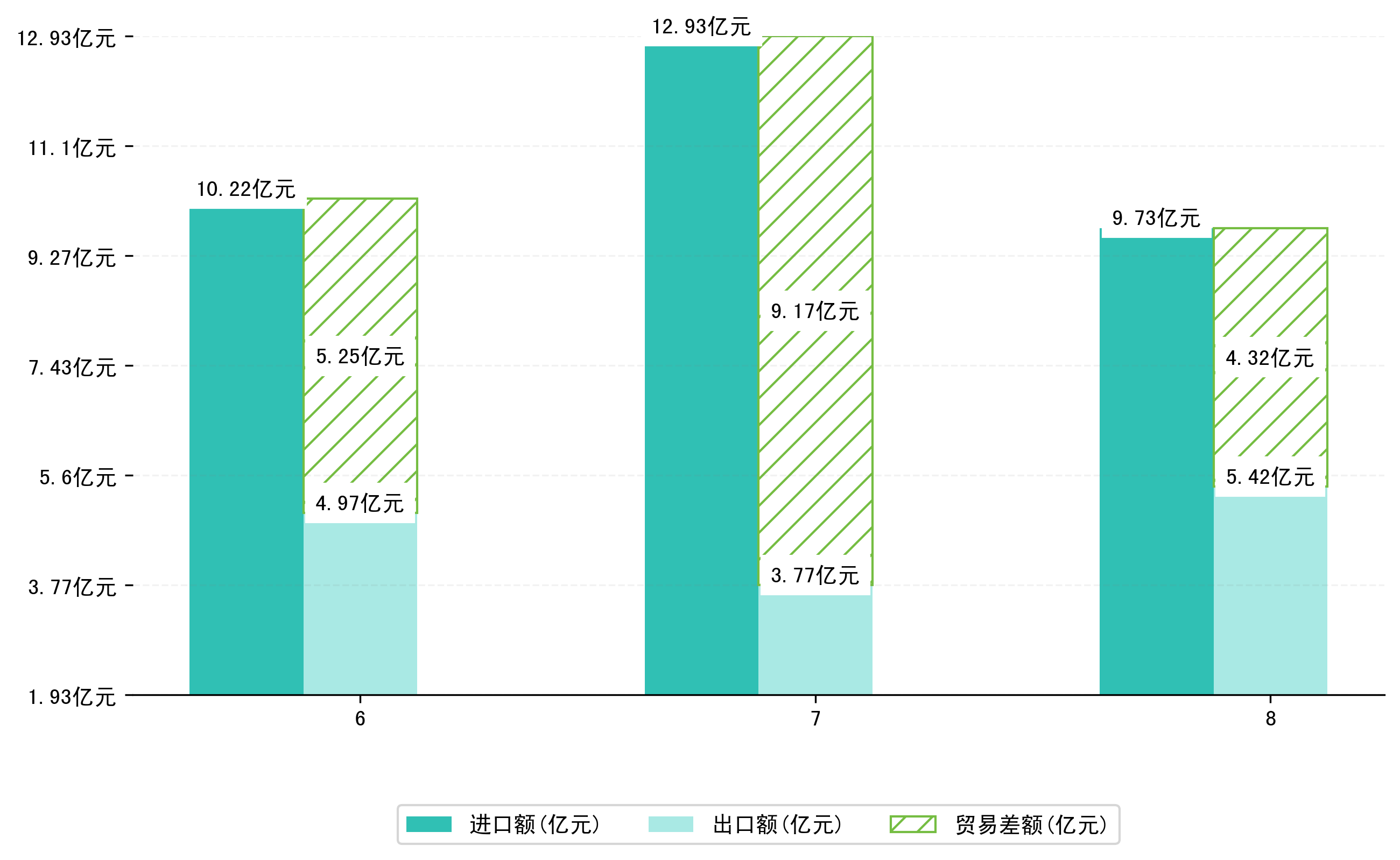 以人民币计,2025年8月茂名市贸易差额为4,3191,0031万元(贸易逆差),相比上月增加了4,8479,3750万元,即6722,5094万美元;相比上年同期增加了4642,6095万元,同比增加-9.71%。