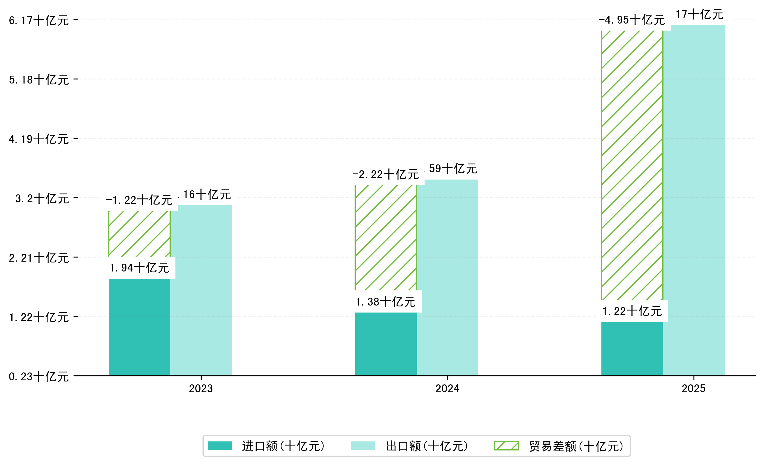 以人民币计,2025年2月绵阳市贸易差额为34,1282,6487万元(贸易顺差),相比上月增加了18,7481,4617万元,即2,6104,7481万美元;相比上年同期增加了31,5584,6022万元,同比增加1228.05%。
