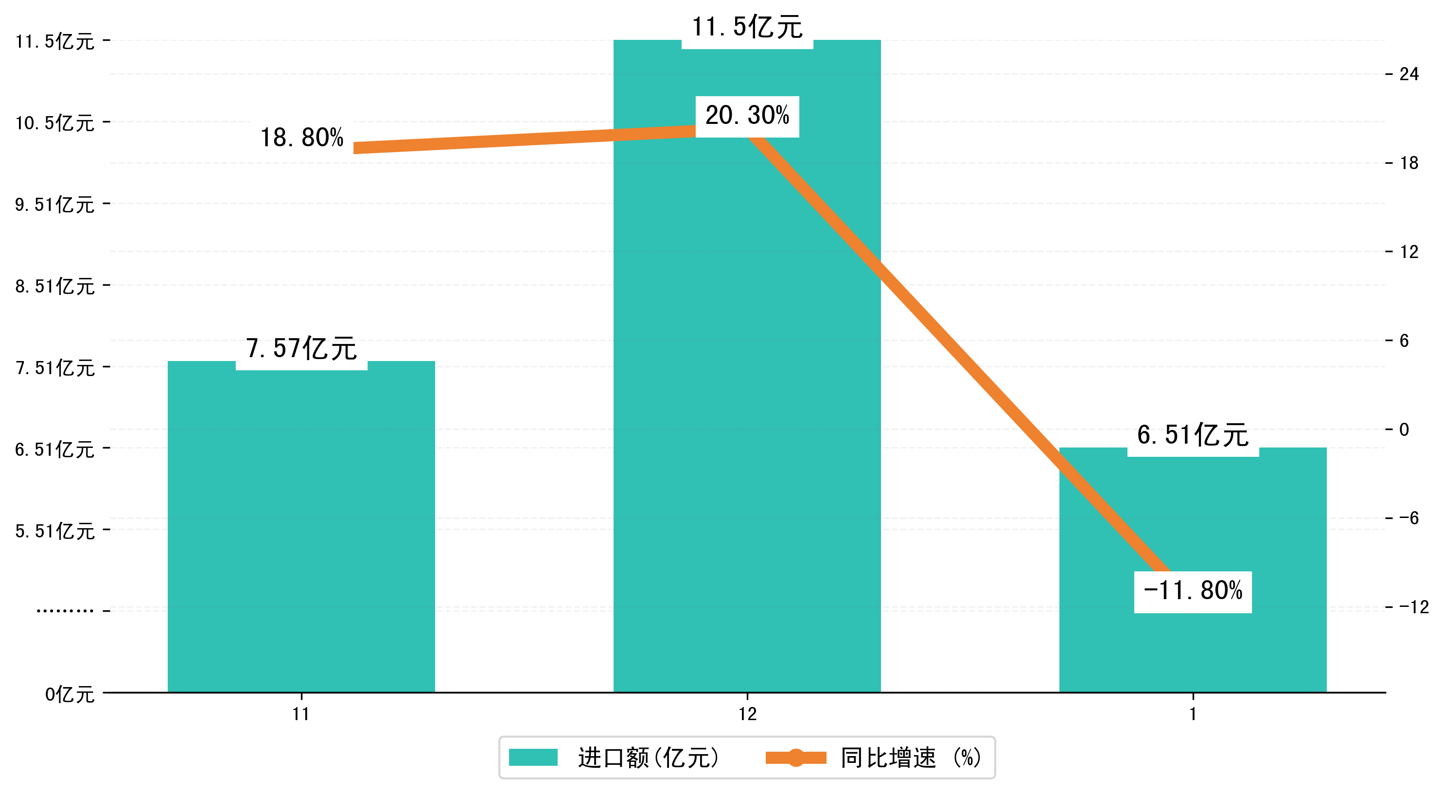 以人民币计,2025年1月绵阳市进口额为6,5115.1471万元,相比上月减少了4,9898.1207万元;相比上年同期减少了8363.8243万元,同比减少了-11.80%。