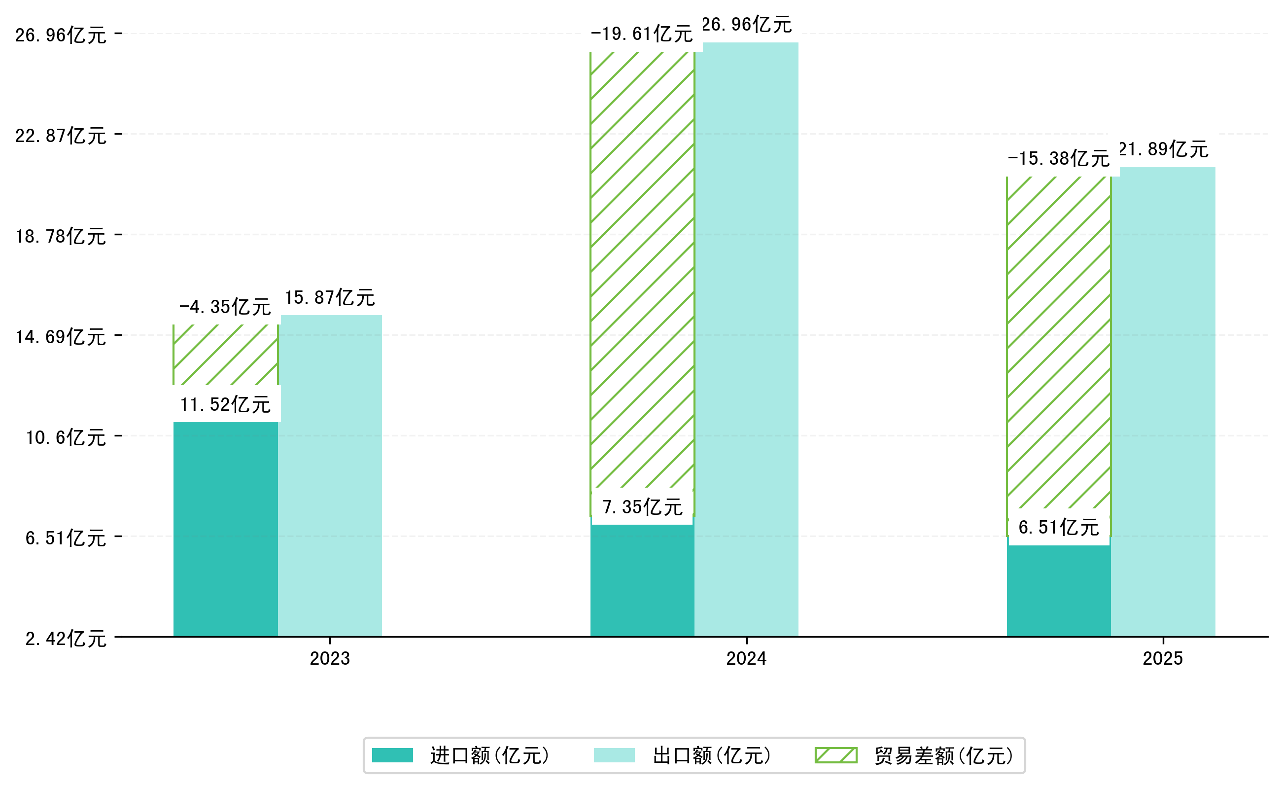 以人民币计,2025年1月绵阳市贸易差额为15,3801,1870万元(贸易顺差),相比上月增加了4182,9893万元,即607,7363万美元;相比上年同期减少了4,2327,5055万元,同比减少-21.58%。