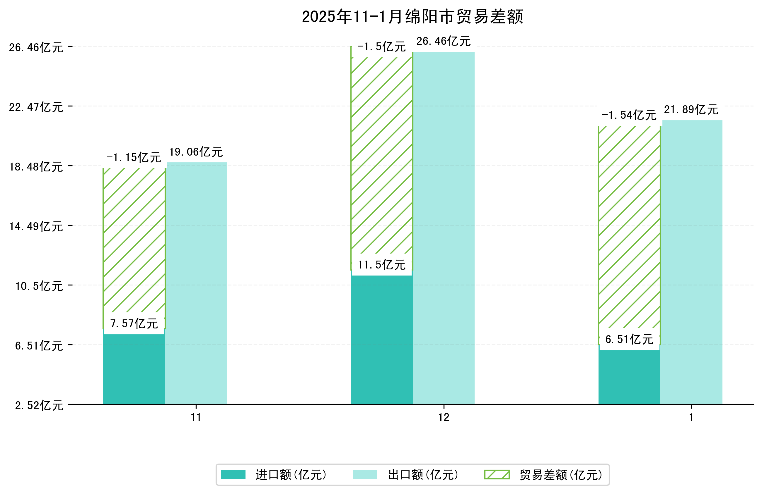 以美元计,2025年1-1月绵阳市贸易差额为2,1381,7009万美元(贸易顺差),相比上年同期减少了6296,6838万美元,同比减少-22.75%。