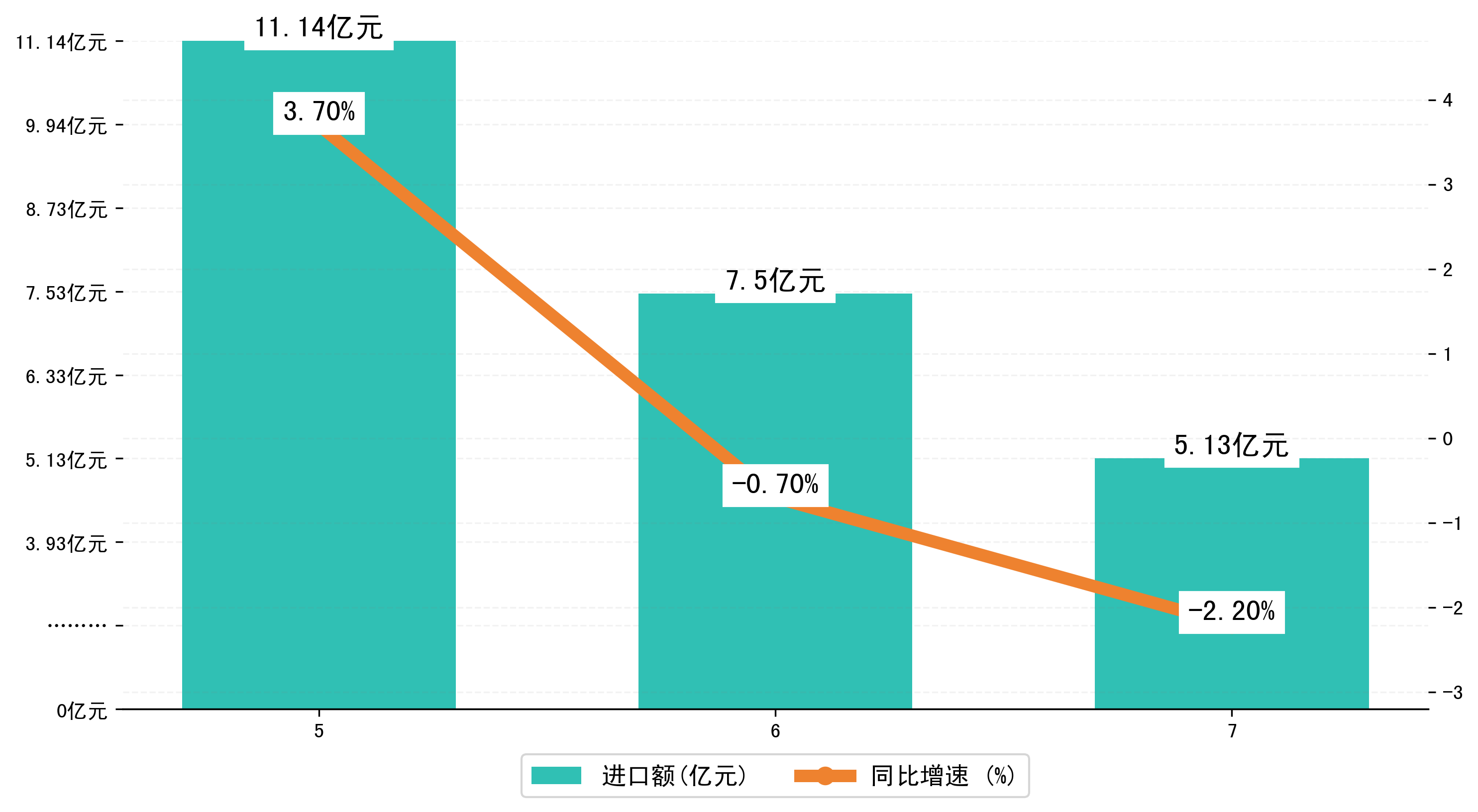 以美元计,2025年1-7月绵阳市进口额为7,2030.4475万美元,相比上年同期减少了2340.2444万美元,同比减少-3.10%。