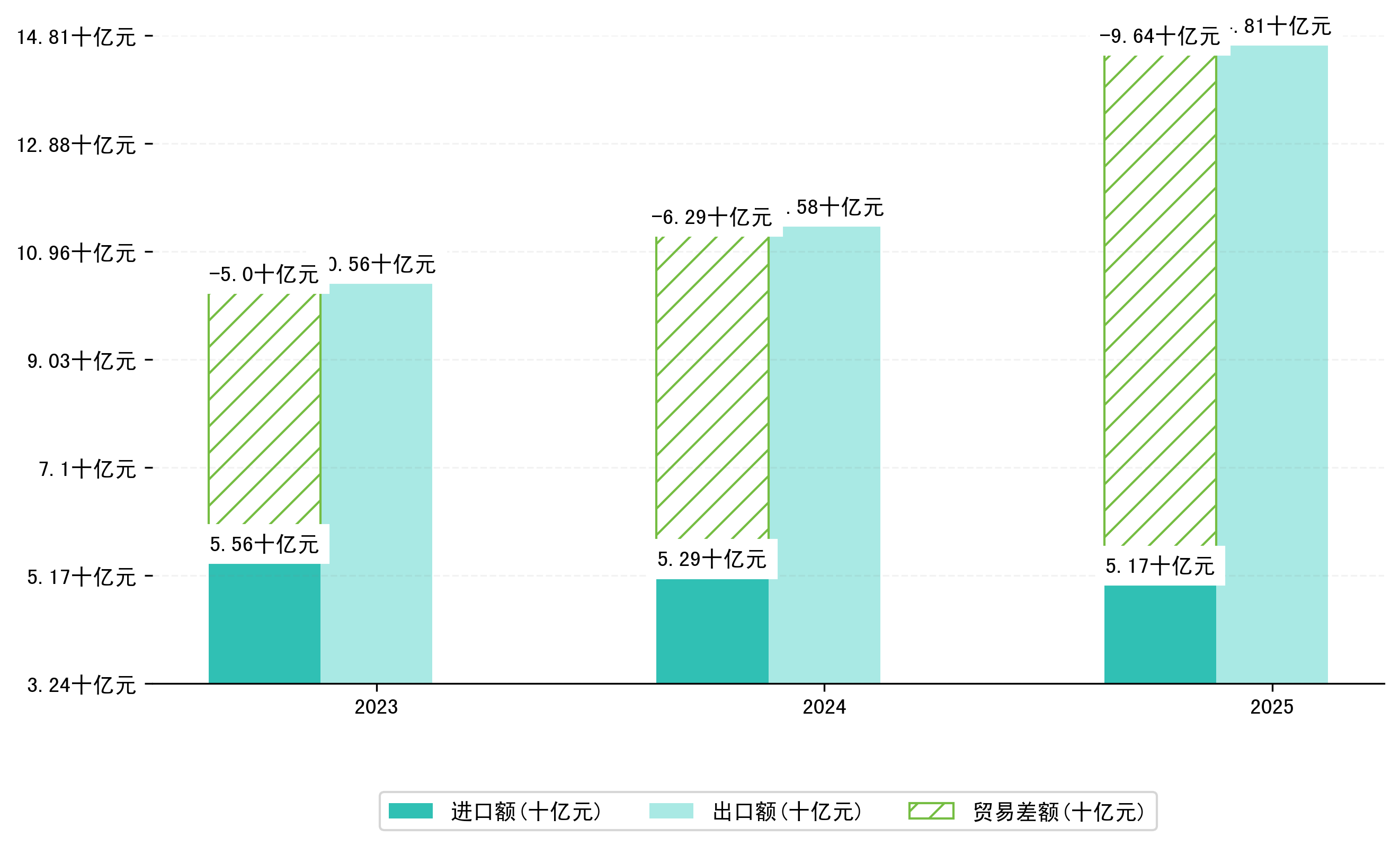 以人民币计,2025年1-7月绵阳市贸易差额为96,4166,7692万元(贸易顺差),相比上年同期增加了33,5150,9146万元,同比增加53.28%。